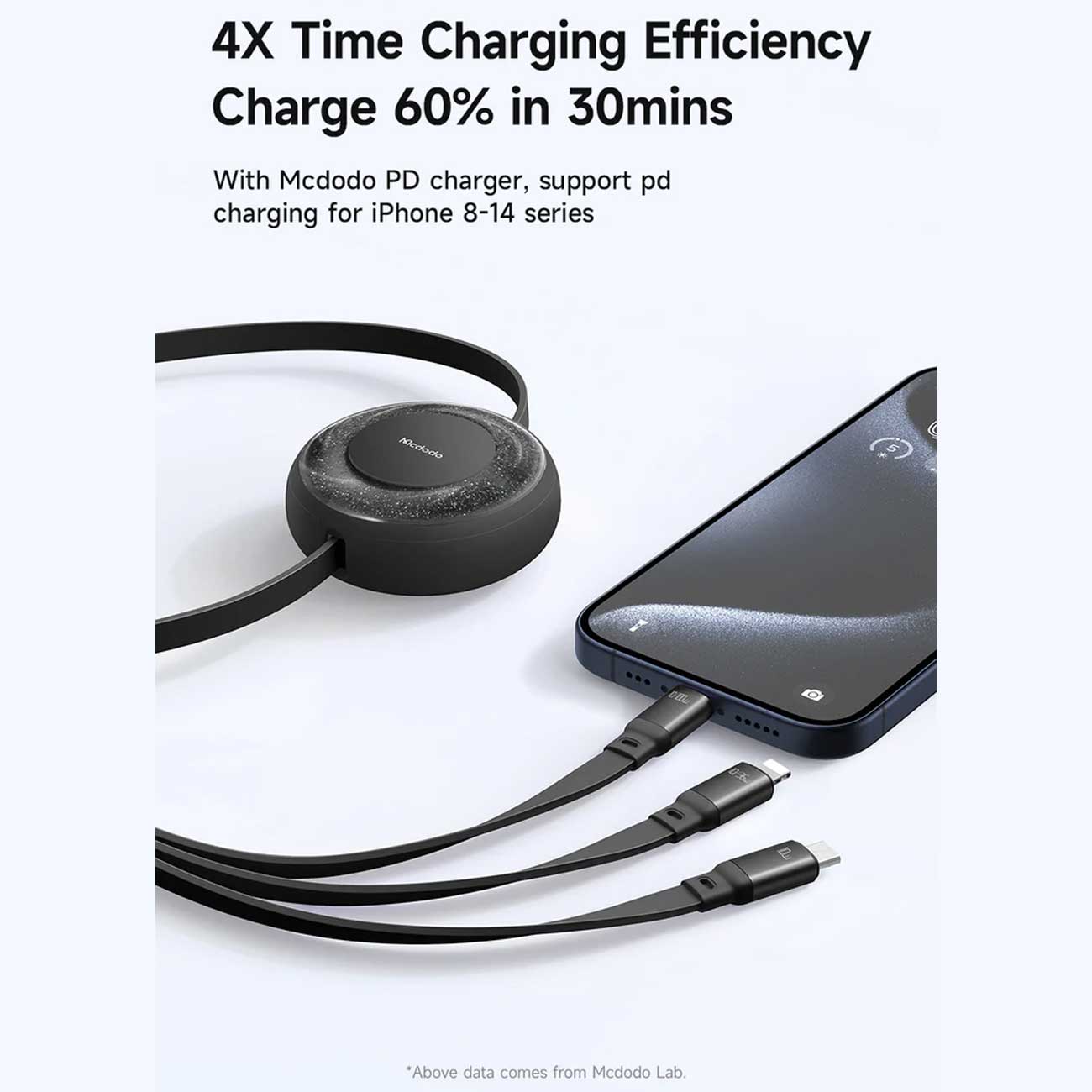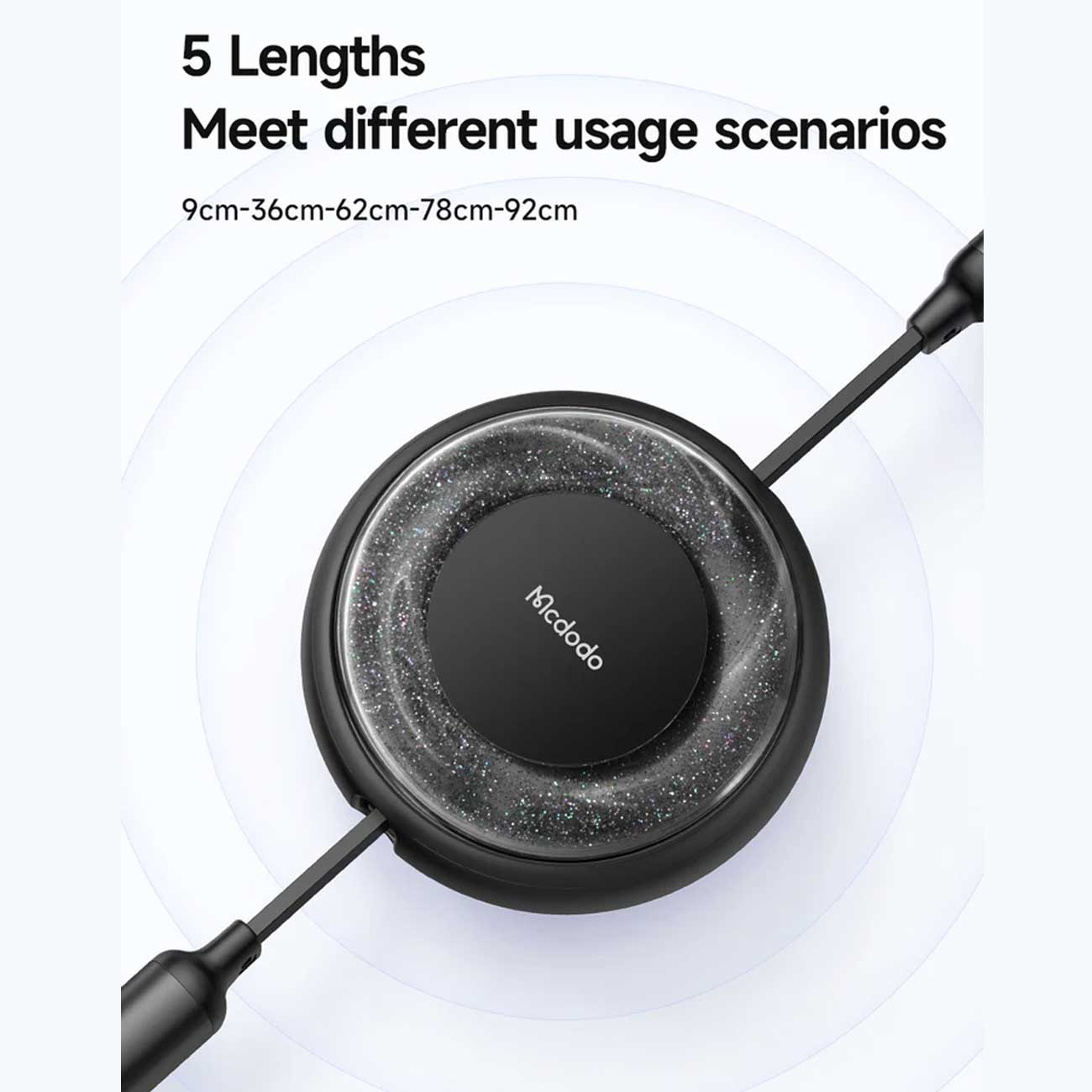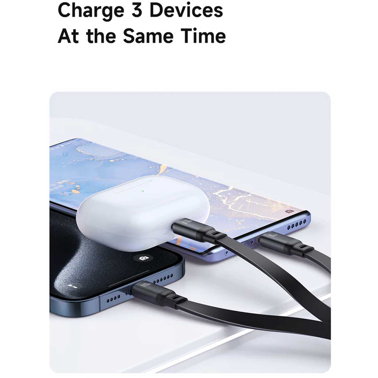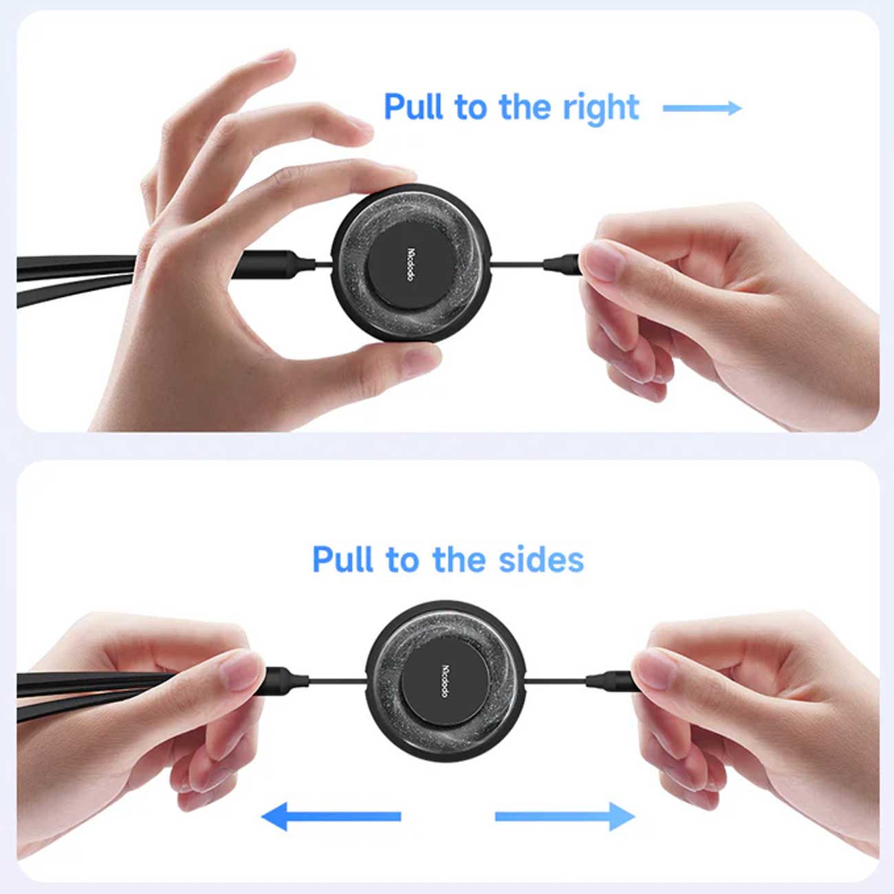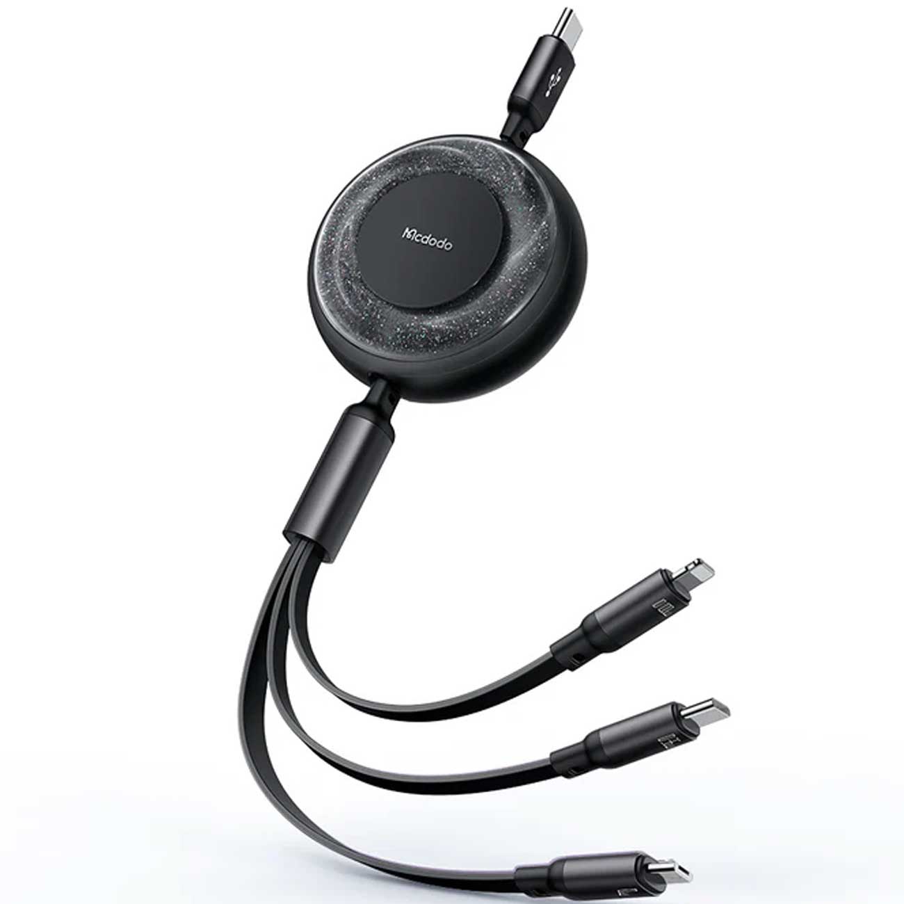 کابل شارژ 1.2 متری جمع شونده مک دودو، با سه کانکتور مستقل از هم توانایی شارژ همزمان سه دستگاه بدون افت جریان و کاهش سرعت را دارد.