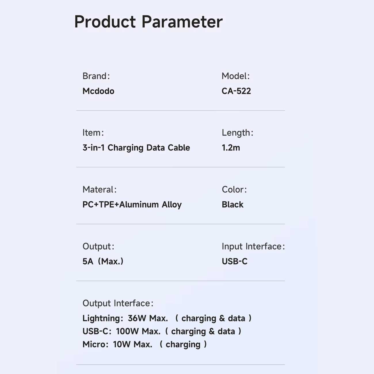 کابل چند سر Mcdodo CA-522، یکی از خلاقانه ترین کابل های تولید شده توسط شرکت مک دودو است که بصورت جمع شونده طراحی شده و کاربر بسته به نیاز خود، میتواند طول کابل را کنترل کند. این کابل از یک کانکتور Type-C در ورودی و 3 کانکتور لایتنینگ + تایپ سی + میکرو یو اس بی در سمت خروجی تشکیل شده است.