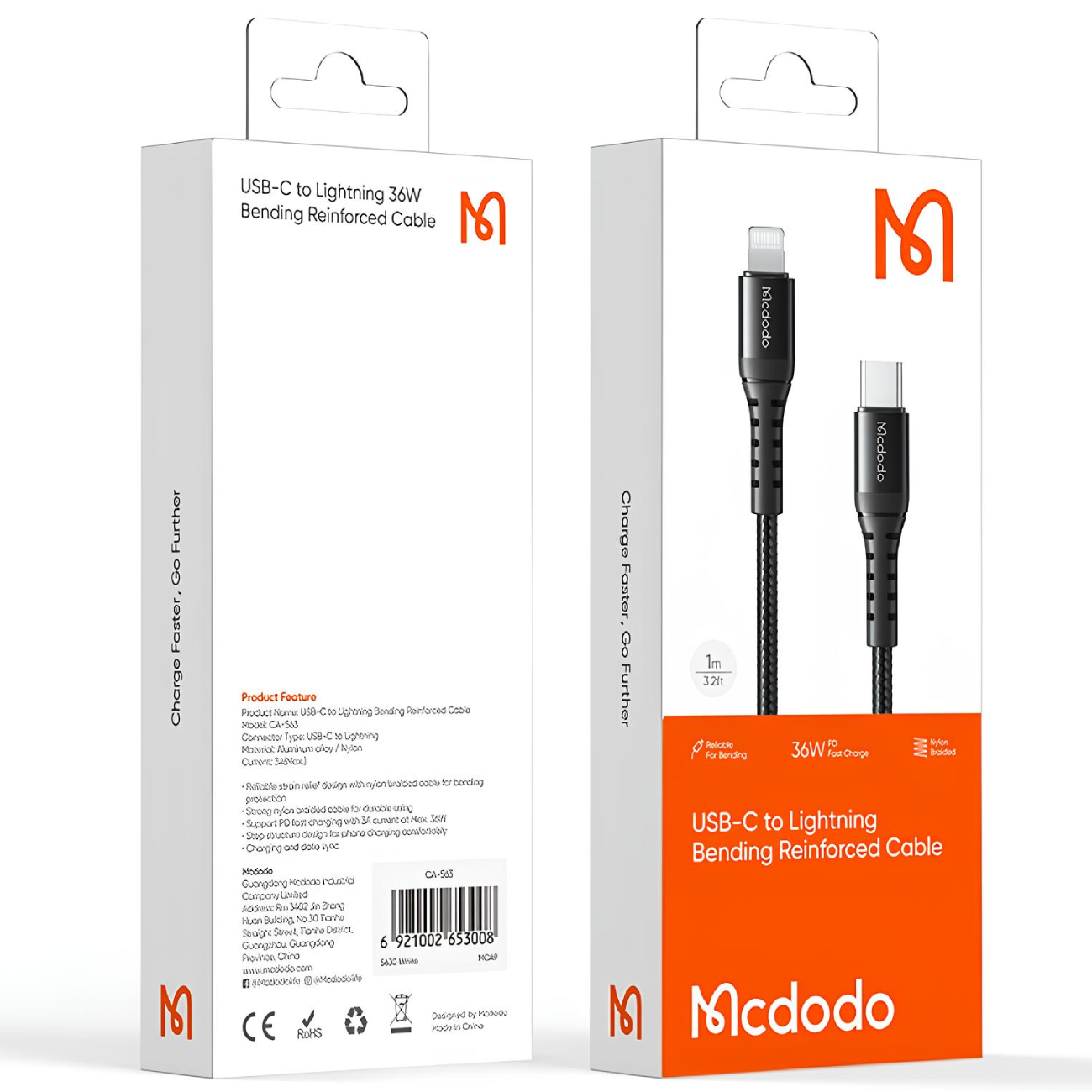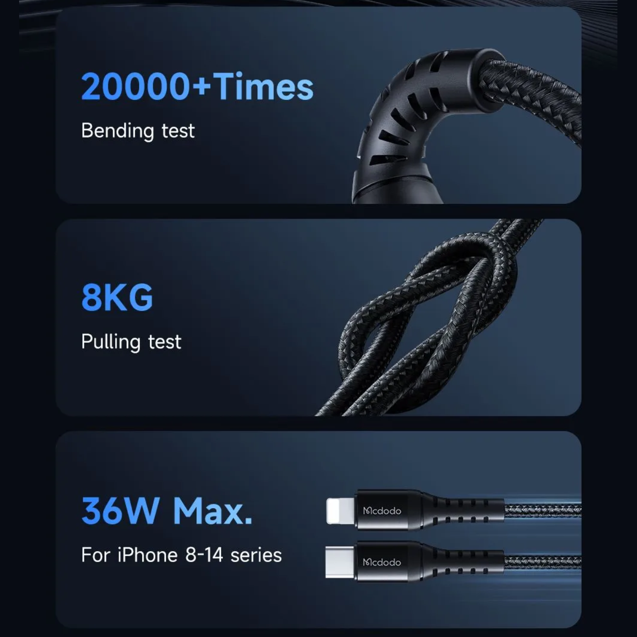 کابل فست شارژ MCDODO CA-5631 با طراحی ویژه و تقویتشده در نقاط اتصال، از مقاومت بالایی در برابر پارگی و آسیب برخوردار است. این کابل قادر است تا 20,000 بار خمش را تحمل کند که گواهی بر کیفیت بالای ساخت آن است. قسمت SR این کابل از مواد پلیاورتان TPU منعطف ساخته شده است که دارای استحکام بیشتری است و ساختار مشبک آن بهگونهای طراحی شده که از آسیبهای داخلی در اثر خم شدن جلوگیری میکند.