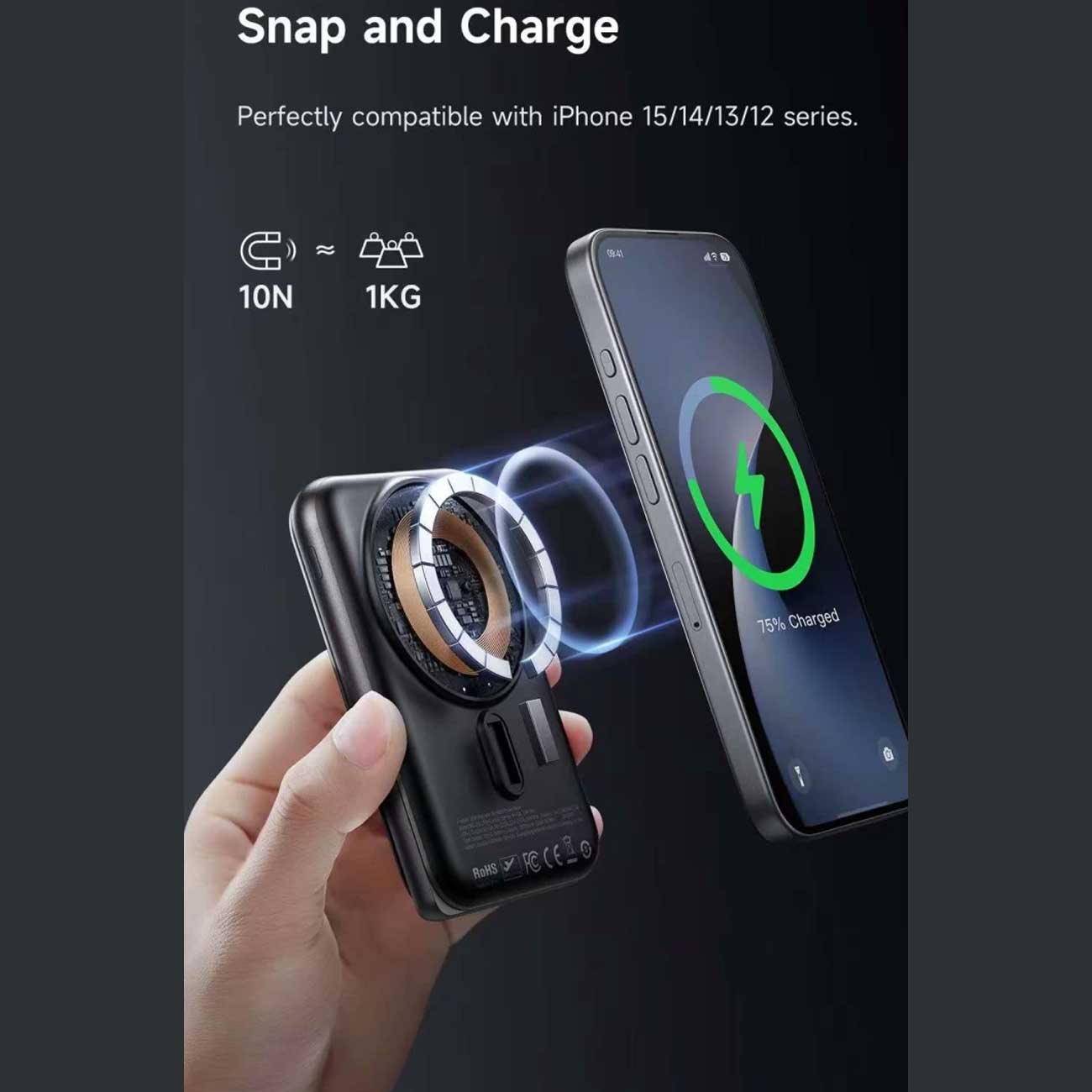 این پاوربانک اپل را میتوان به وسیله یک کابل تایپ سی با ورودی 5V⎓3A, 9V⎓2A, 18W Max شارژ کرد. همچنین دارای یک خروجی تایپ سی با خروجی 5V⎓3A, 9V⎓2.22A, 12V⎓1.67A, 20W Max و مگ سیف با خروجی 15W / 10W / 7.5W / 5W است که میتواند به صورت همزمان دو دستگاه را شارژ کند.