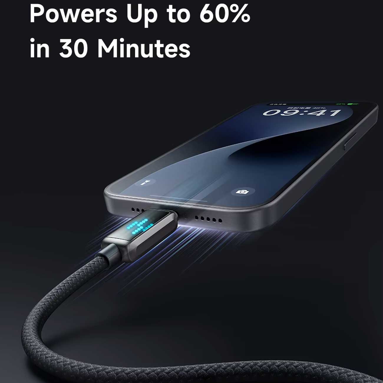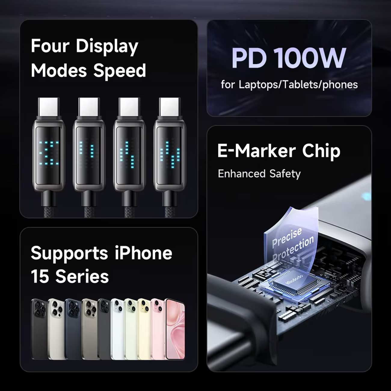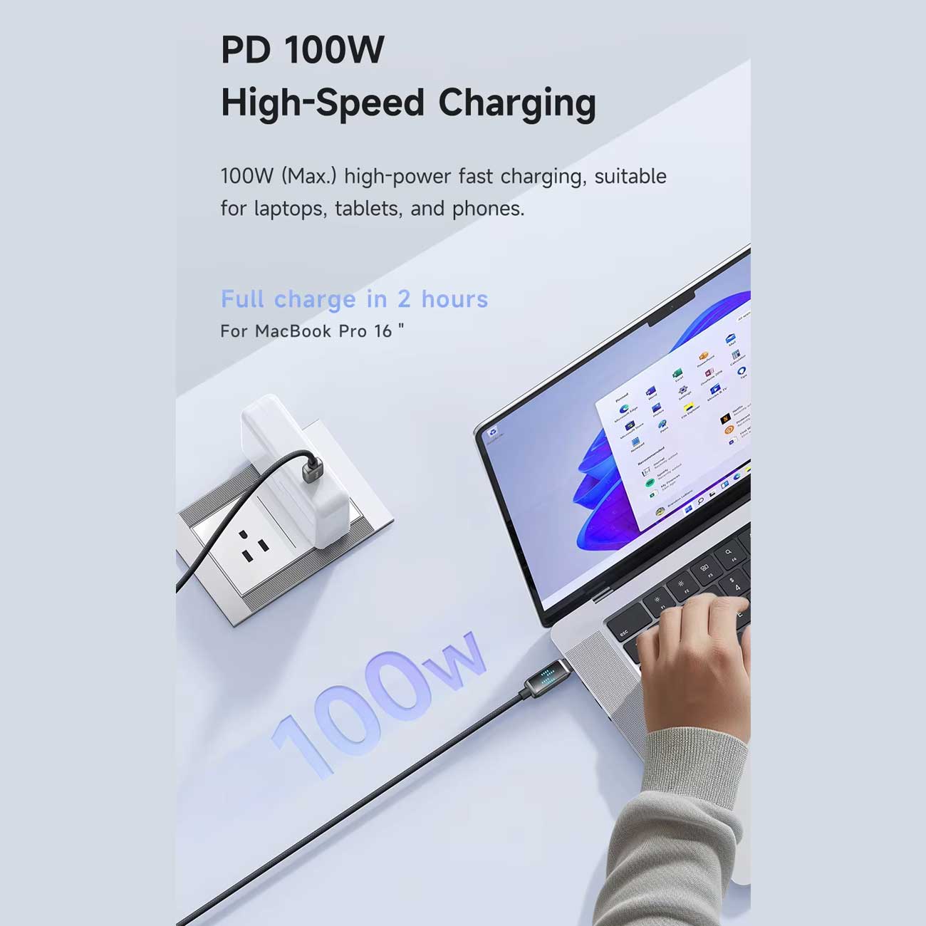 این کابل دارای قدرت شارژ 100 وات بوده است و با شارژ منظم و پایدار؛ همچنین نگه داشتن جریان ورودی به دستگاه متصل میشود. حداکثر شدت جریان عبوری از آن برابر با 5 آمپر است. کابل تایپ سی میتواند دمای دستگاه متصلشده را بهطور هوشمند کنترل کند؛ درنتیجه از داغ شدن تلفن همراه حتی درصورت استفاده از آن روی شارژ جلوگیری میشود.