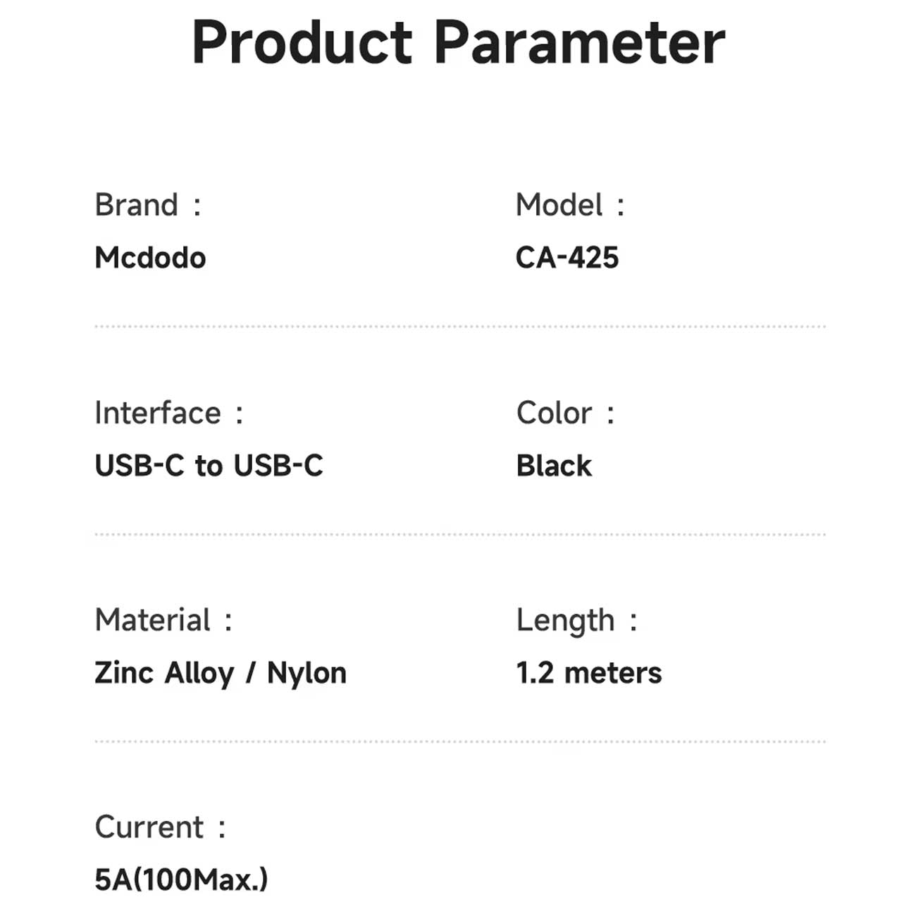 کابل سوپر فست شارژ تایپ سی به تایپ سی 100 وات 5 آمپر 1.2 متری مک دودو CA-425
