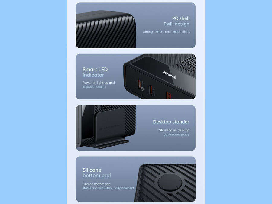 شارژر دیواری 4 پورت مک دودو با تکیه بر طراحی منحصر به فرد خود امکان قرار گرفتن در حالت ایستاده و با خوابیده را دارد از آنجایی که نیروی ورودی از طریق یک کابل 1.5 متری AC که در پکیج دستگاه موجود است تامین می گردد محدودیتی در زمینه شکل قرار گیری وجود نخواهد داشت وجود پایه های سیلیکونی به ثبات شارژر روی سطح صاف کمک شایانی می کند. همچنین وجود یک پایه نگهدارنده به ثبات بیشتر شارژر و زیبایی میز کار شما نیز می افزاید. وجود یک چراغ LED با طرح لوگوی Mcdodo بر زیبایی شارژر افزوده است.