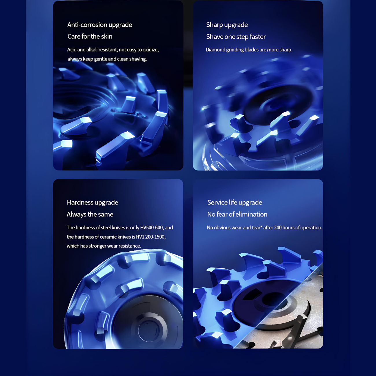 تیغههای سرامیکی: تیغه سرامیکی که استفاده شده، به طور خاص از پودر سرامیکی اکسید شده با کیفیت بالا ساخته شده و بههیچوجه نمیتواند به پوست آسیب برساند. این نوع تیغه، تیز و مقاوم بوده و میتواند اصلاحی نرم و مطمئن را برای کاربر فراهم کند.