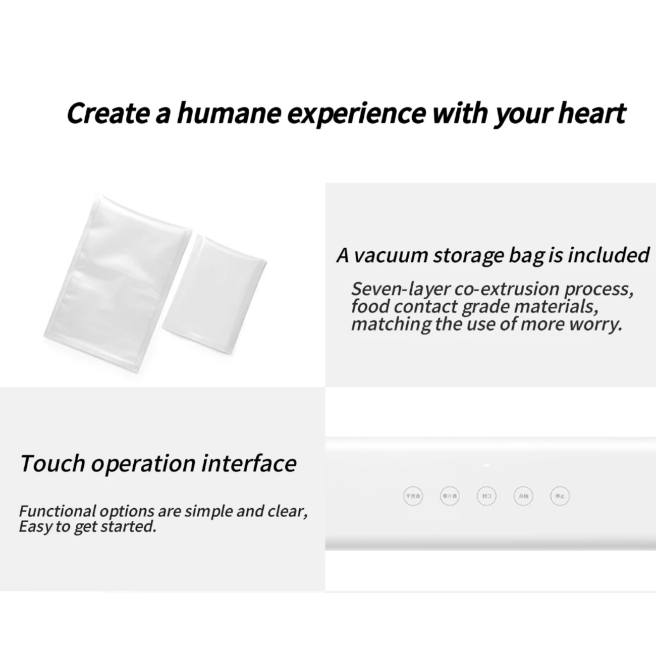 دستگاه بستهبندی وکیوم شیائومی مجهز به رابط کاربری لمسی است که کار با آن را بسیار ساده میکند. تنها با لمس یک دکمه میتوانید فرآیند وکیوم و بستهبندی را انجام دهید. همچنین، امکان تنظیم حالتهای مختلف برای بستهبندی مواد غذایی متنوع فراهم شده است.