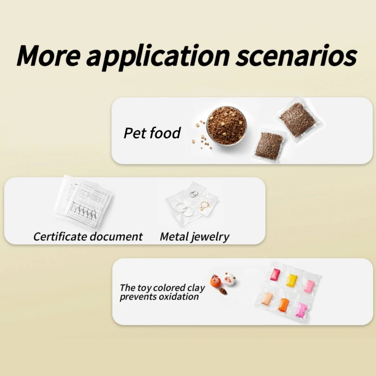 علاوه بر بستهبندی مواد غذایی، این دستگاه برای نگهداری وسایل دیگری مانند داروها، اسناد، جواهرات و وسایل فلزی نیز قابل استفاده است. همچنین، برای آمادهسازی غذاهای مخصوص پخت Sous Vide، این دستگاه ایدهآل خواهد بود.