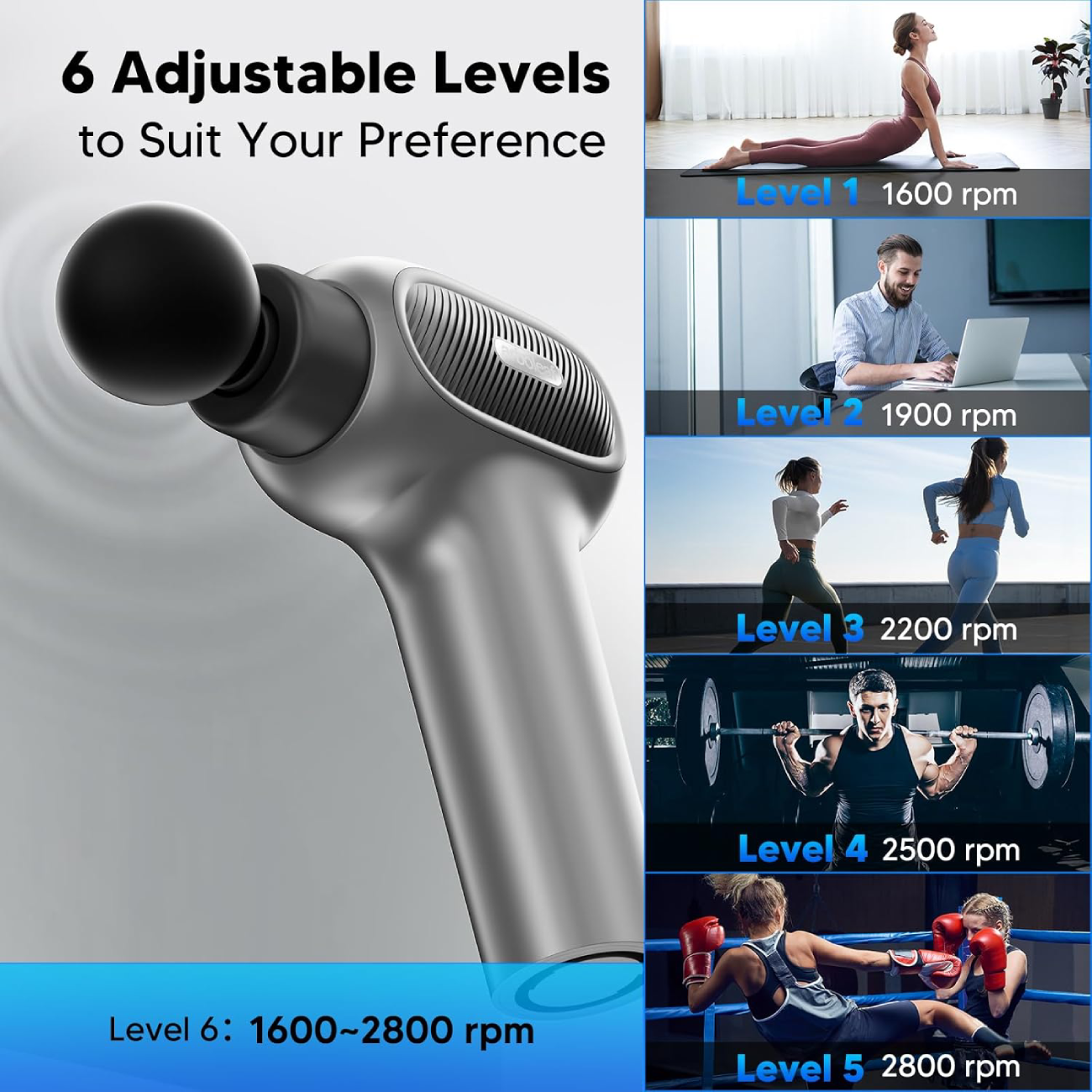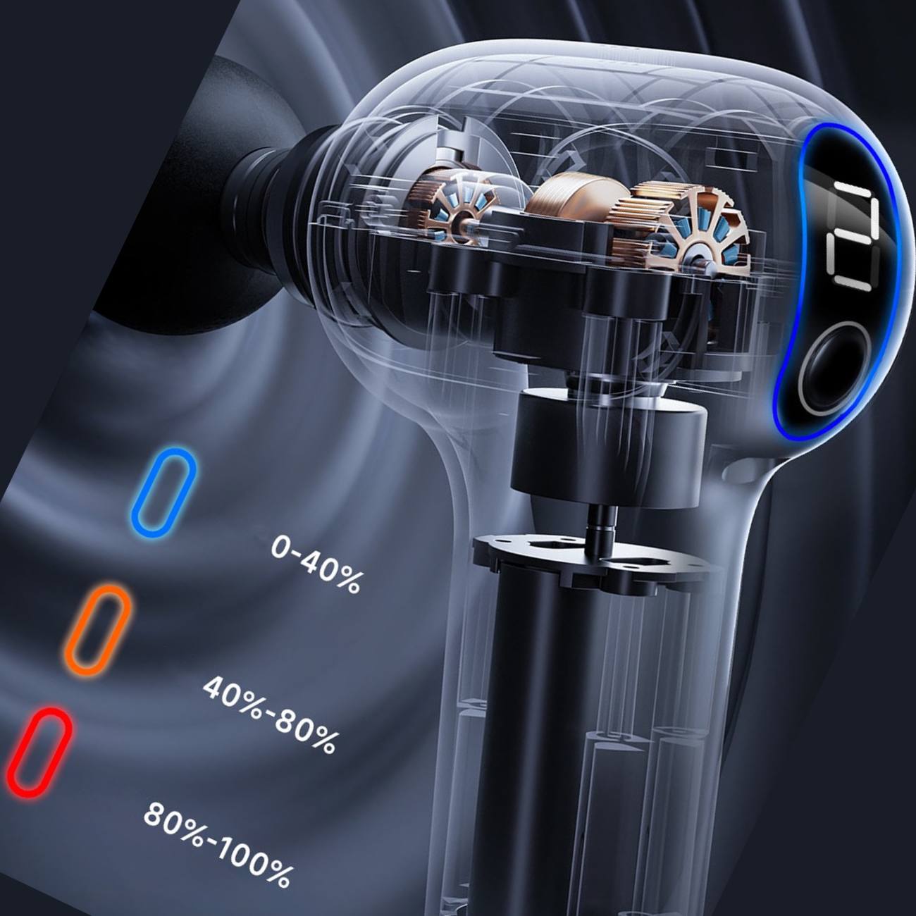 این تفنگ ماساژ دارای نمایشگر LED برای نمایش سطح سرعت و میزان فشار وارده است. این دستگاه از 5+AI سطح سرعت قابل تنظیم (1600 تا 2800 دور در دقیقه) برخوردار است که برای کاربران مبتدی و حرفهای مناسب میباشد. همچنین، حالت سرعت تطبیقی بهطور خودکار شدت ماساژ را با توجه به میزان فشار دست شما تنظیم میکند تا تجربهای کاملاً شخصیسازیشده داشته باشید.