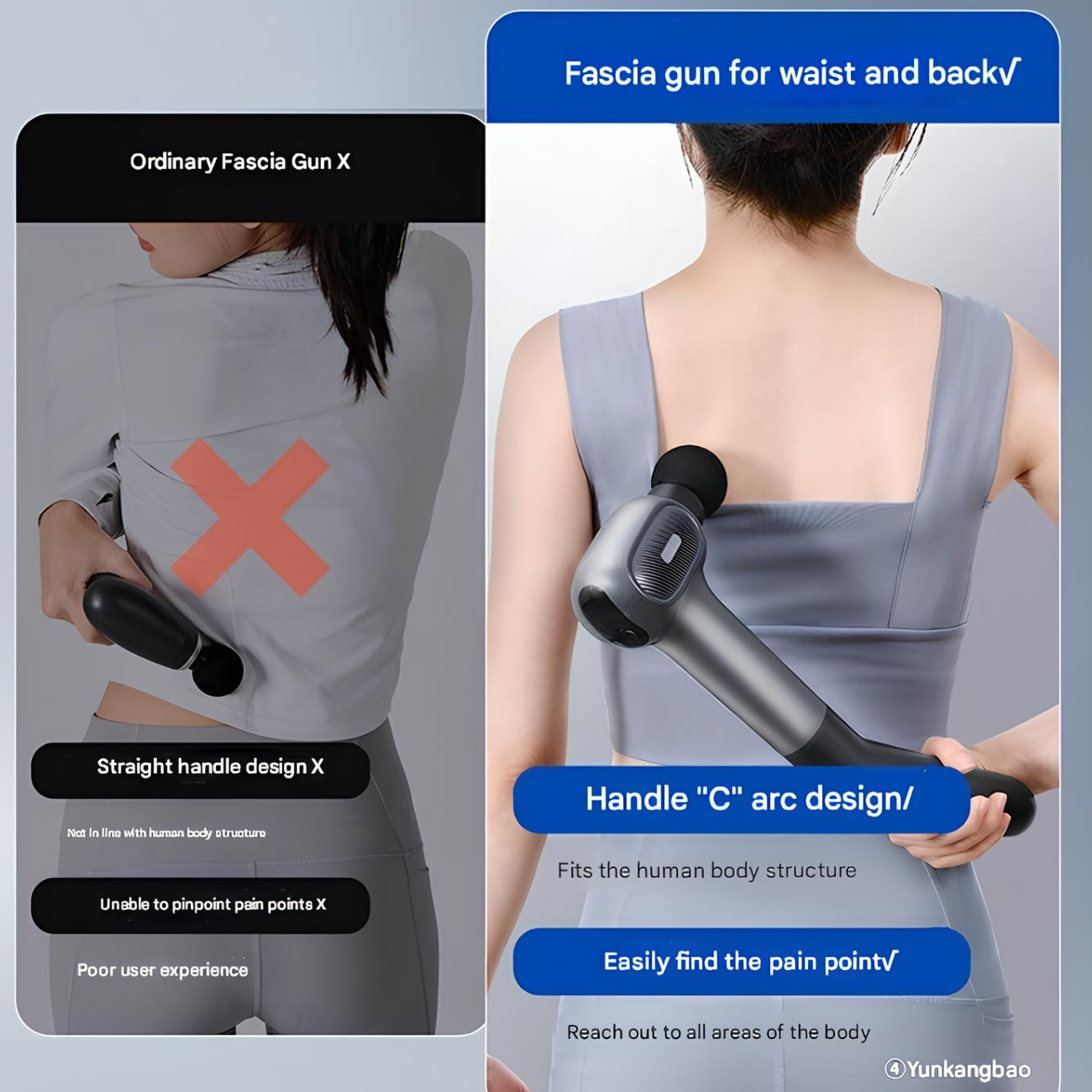 یکی از نکات برجسته طراحی این ماساژور، دسته منحنی قوس دار (C-Arc) آن است که به شما امکان میدهد نواحی سختدسترس مانند پشت، کتف و رانها را به راحتی ماساژ دهید. این طراحی ارگونومیک فشار وارده به مچ دست را کاهش داده و امکان کنترل بهتر در حین استفاده را فراهم میکند.