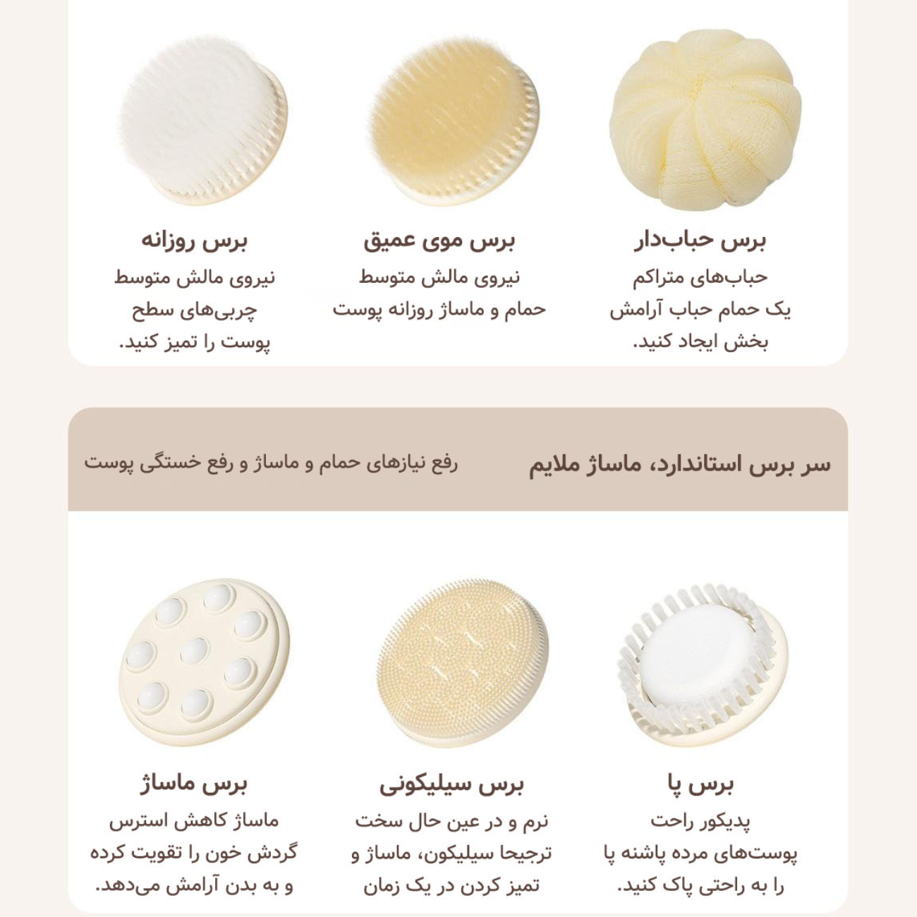 برس قابل شارژ برای شستشوی بدن دوکو شیائومی دارای شش نوع سر برس متفاوت است که هر کدام عملکرد خاصی برای مراقبت از پوست دارند. این سرها شامل: