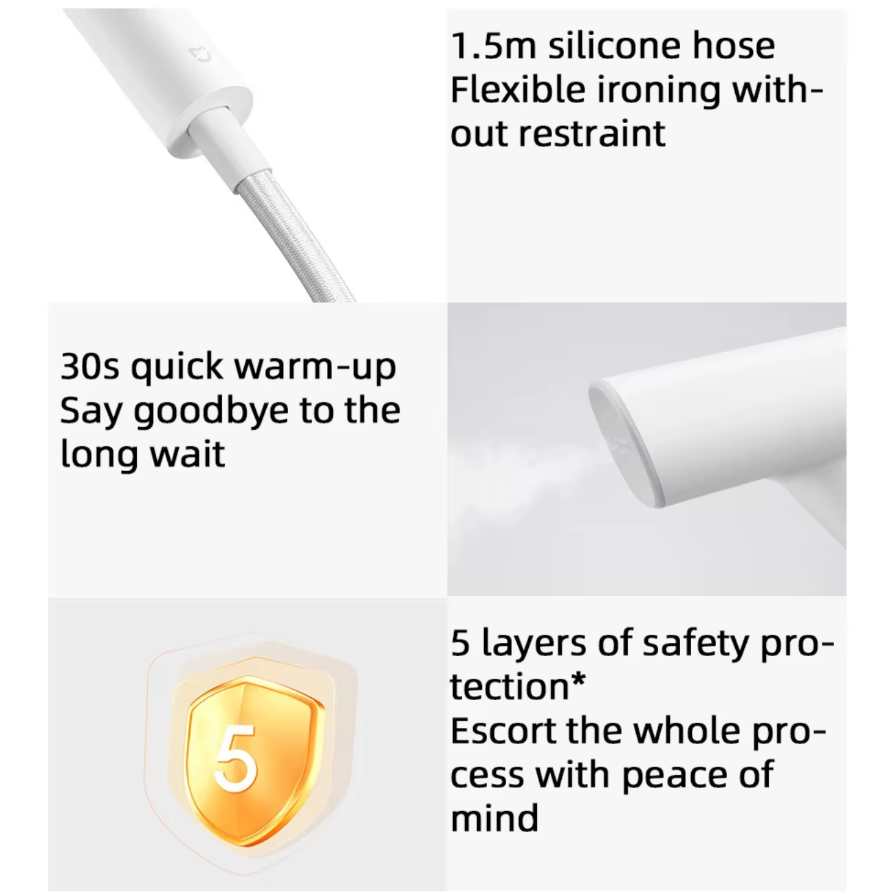 اتو بخار ایستاده MIJIA مدل GARMENT ZQGTJ02KL دارای پنج سطح محافظتی از جمله محافظت در برابر گرمای بیش از حد، قطع خودکار در صورت اتمام آب، و سیستم جلوگیری از نشت بخار است. این ویژگیها امنیت کاربر را تضمین کرده و باعث افزایش دوام دستگاه میشود.