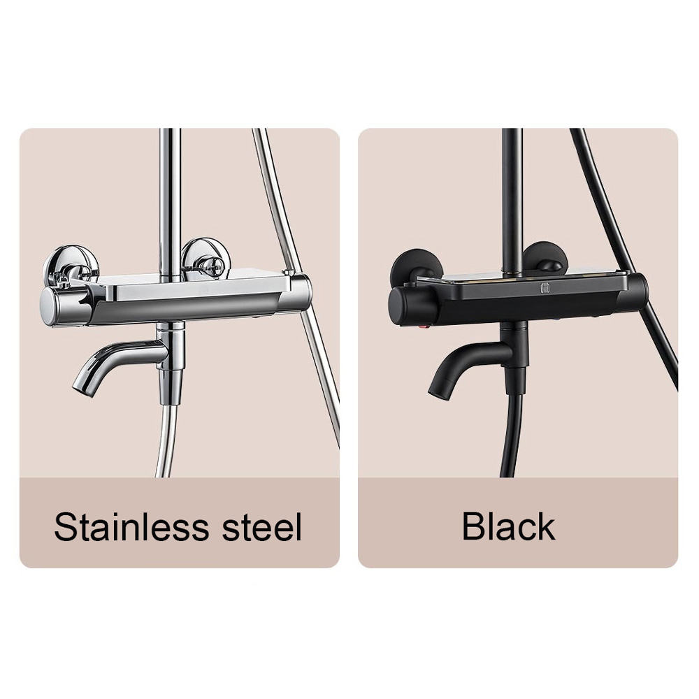 مجموعه دوش DIIIB DXHW001 از نظر طراحی در سطح بالایی از کارایی و زیبایی قرار دارد. ترکیب استیل ضد زنگ 304، مس و ABS، همراه با پوشش آبکاری شده، ظاهری مدرن و در عین حال مقاوم ایجاد کرده است. این محصول در دو مدل استیل براق و مشکی با کنترل پنل شیشهای عرضه میشود تا با سبکهای مختلف دکوراسیون داخلی هماهنگ شود. نازلهای آب از سیلیکون باکیفیت ساخته شدهاند که در برابر رسوبات مقاوم بوده و دوام بالایی دارند. دسته دوش ارگونومیک طراحی شده تا استفاده طولانیمدت از آن بدون خستگی باشد.