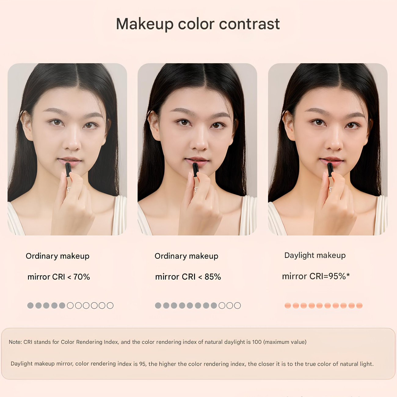نور آینه به گونهای طراحی شده که قادر است 95% از رنگهای طبیعی نور روز را بازتولید کند، به این معنی که شما میتوانید آرایش خود را در نور مشابه نور طبیعی ببینید و بدین ترتیب از اشتباهات رایج جلوگیری کنید. این ویژگی به شما کمک میکند تا آرایش خود را بهویژه در شرایط نوری مختلف به دقت انجام دهید.