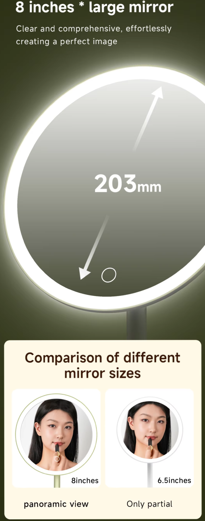 این آینه با سایز بزرگ 8 اینچ (203 میلیمتر) امکان مشاهده واضح و کامل صورت را فراهم میکند. شما میتوانید جزئیات آرایش خود را به خوبی مشاهده کنید و از این رو به راحتی آرایش خود را تنظیم کنید.