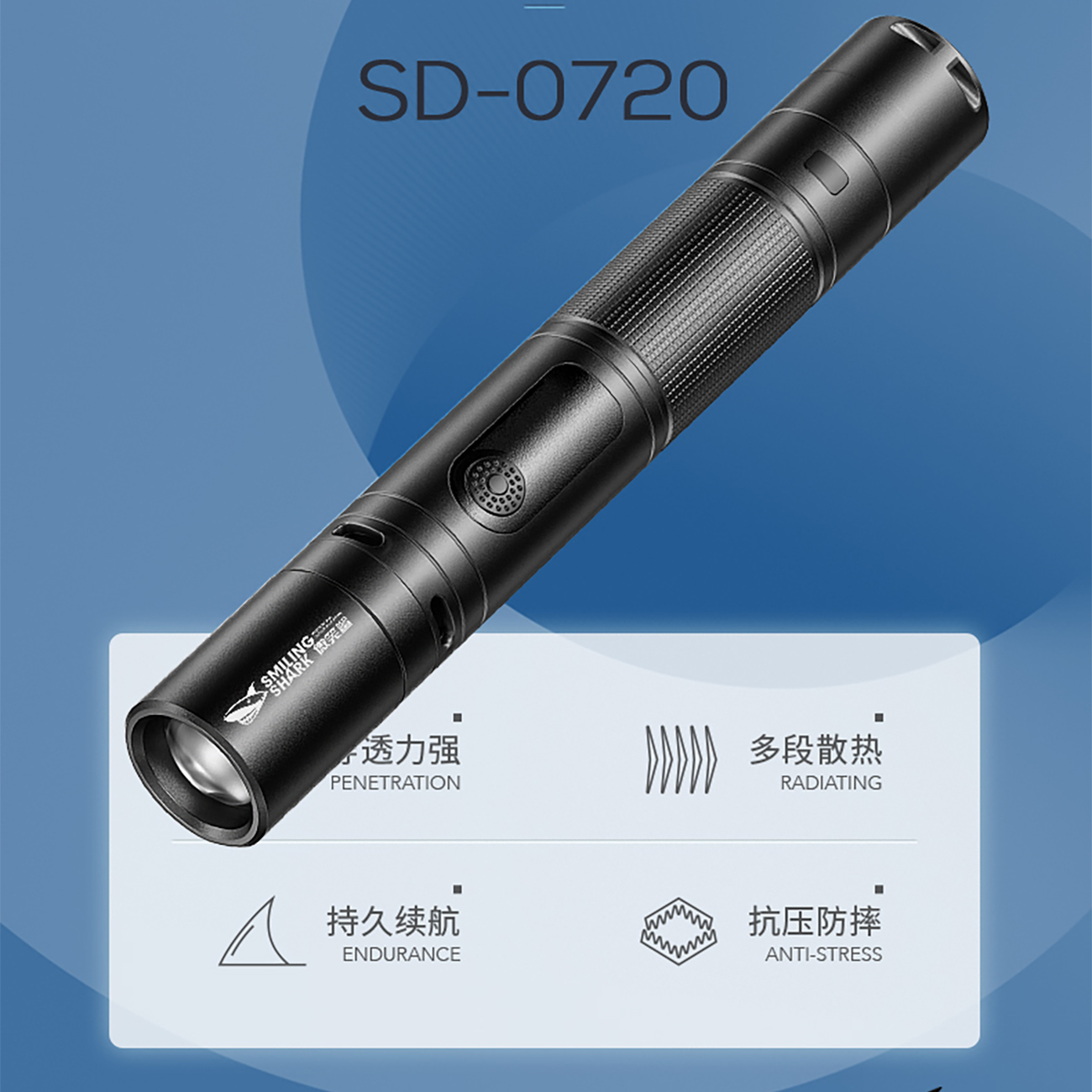 لامپ SD-0720 smiling shark دارای فیتیله نور سفید M60 با روشنایی بالا و عمر طولانی است. نور لیزری از فاصله دور مانند شمشیر لیزری در شب پرتاب میشود و به شدت در شب میدرخشد و شما را در شب های تاریک همراهی میکند.