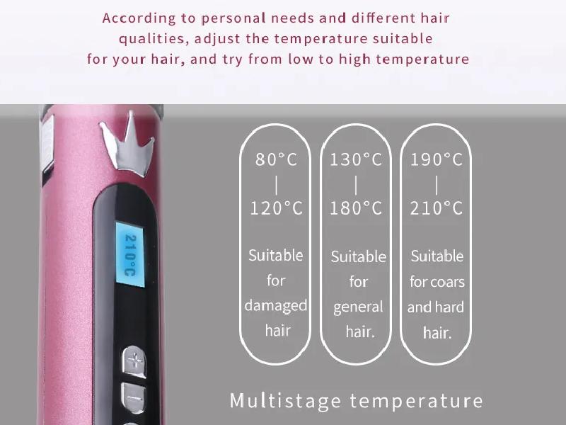 فر کننده موی سر Kemei قابلیت تنظیم دما از 80 تا 210 درجه سانتی گراد را دارد که میتوانید دمای آن را با توجه به کیفیت مویتان از دمای کم به بالا تنظیم کنید. محدوده دمای 80 تا 120 درجه مناسب برای موهای آسیب دیده، دمای 130 تا 180 درجه مناسب برای موهای معمولی و دمای 190 تا 210 درجه مناسب برای موهای ضخیم و سخت است.