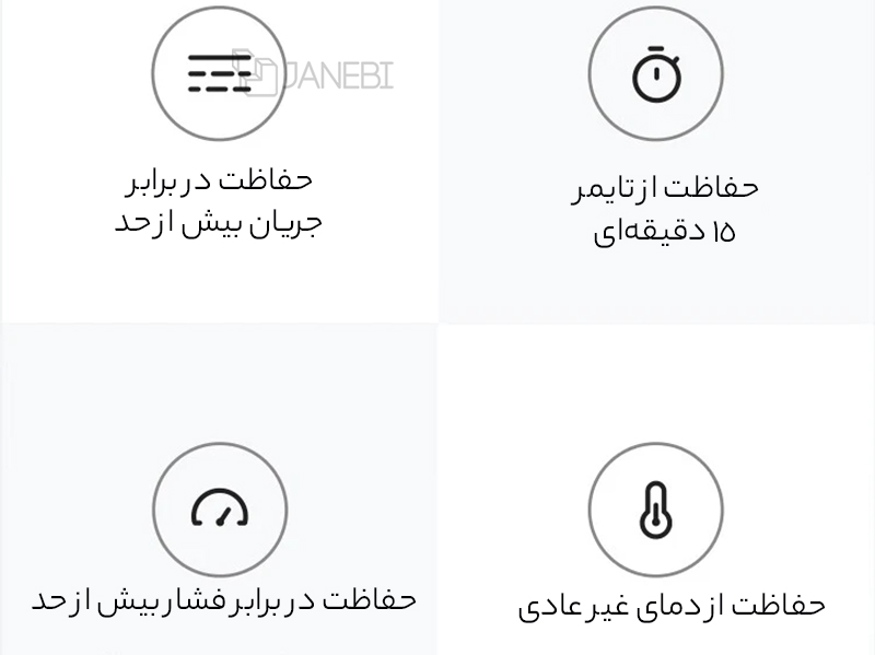 | مکانیسم های حفاظتی چندگانه | حفاظت در برابر جریان بیش از حد/محافظت در برابر فشار بیش از حد/حفاظت زمانبندی 15 دقیقه/محافظت در برابر ناهنجاری دما |