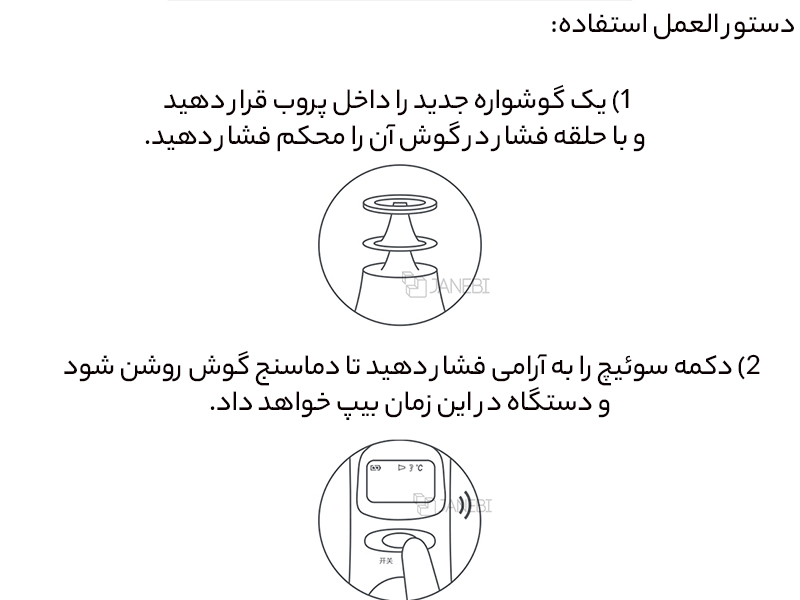 هنگام اندازه گیری دما، پروب را در مجرای گوش قرار دهید تا به طور کامل مجرای گوش را پر کند، آن را با پرده گوش تراز کنید، دکمه اندازه گیری را به آرامی فشار دهید و پس از شنیدن صدای بیپ به مدت حدود 1 ثانیه اندازه گیری را انجام دهید.پس از موفقیت آمیز بودن اندازه گیری، بدنه بوق می زند و صفحه نمایش، نتیجه را نشان می دهد. عملیات ساده و واضح است.