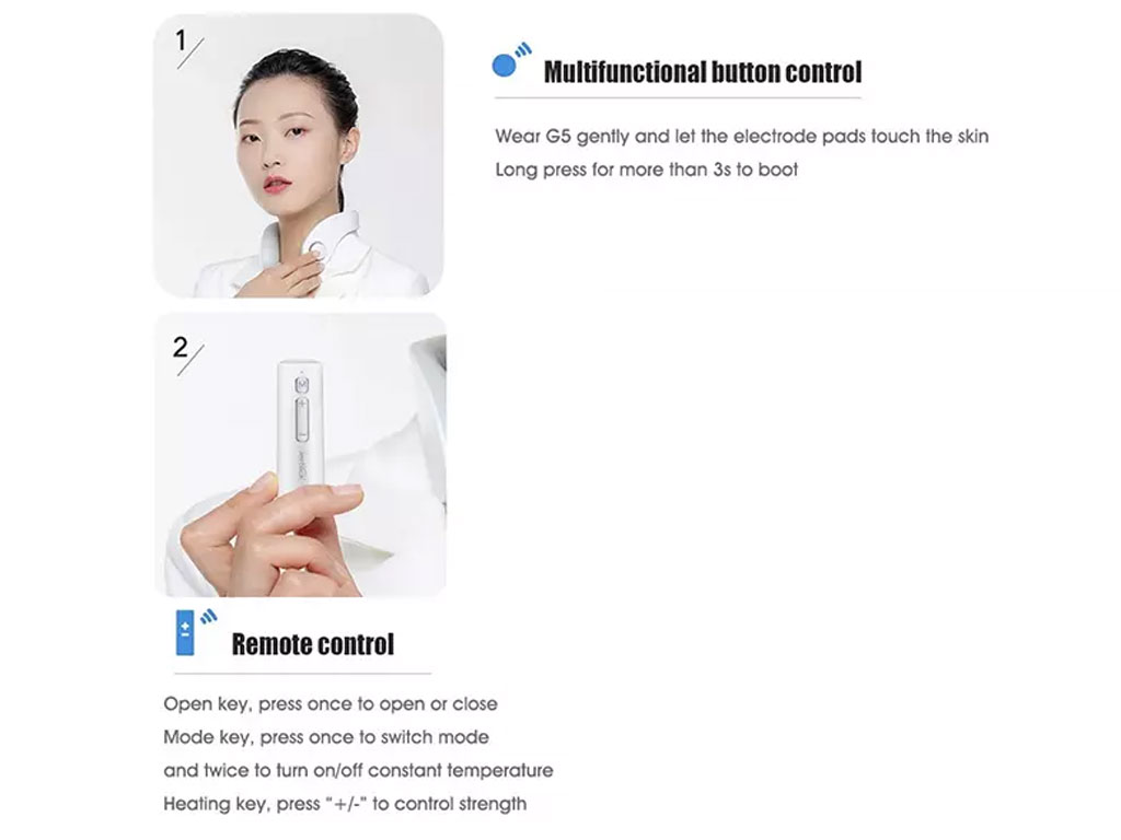 دستگاه ماساژ گردن جی بک جی 5 مجهز به کنترل از راه دور است. به طور خاص، شما می توانید مستقیماً با دکمه فیزیکی روی دستگاه، از طریق کنترل از راه دور ارائه شده، دستگاه را کنترل نمایید. توجه داشته باشید تنها زمانی می توانید از ریموت کنترل استفاده کرد که بدنه اصلی ماساژور روشن باشد.