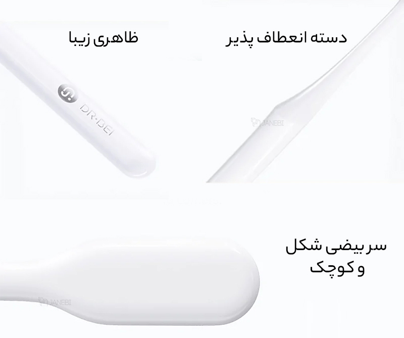 -سر مسواک بیضی شکل و کوچک بوده و براحتی میتواند حفره های دور از دسترس دهان و دندان ها را با ابعاد کوچک و انعطاف خود تمیز کند.