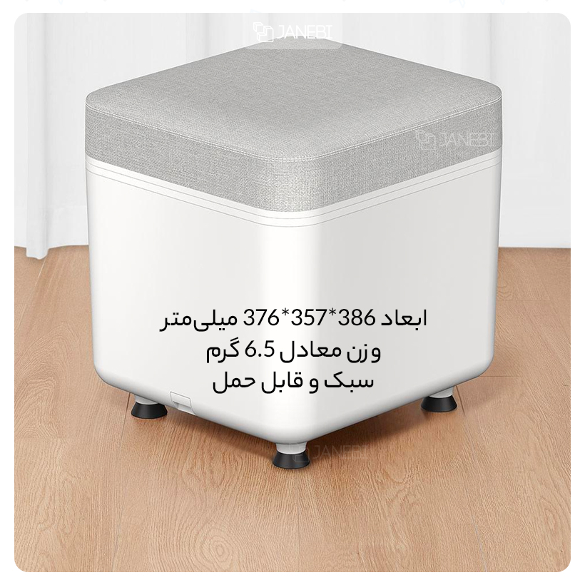 ماساژور پا X5 شیائومی طراحی بسیار جذابی دارد. به صورت یک مکعب است؛ ابعادی برابر با 386*357*376 میلیمتر و وزنی معادل 6.5 گرم دارد. سبک است و برای حمل آن دستگیرهای روی بدنه تعبیه شده. مواد تشکیل دهنده بدنه آن پلاستیک ABS، TPE و پلیپروپیلن است.