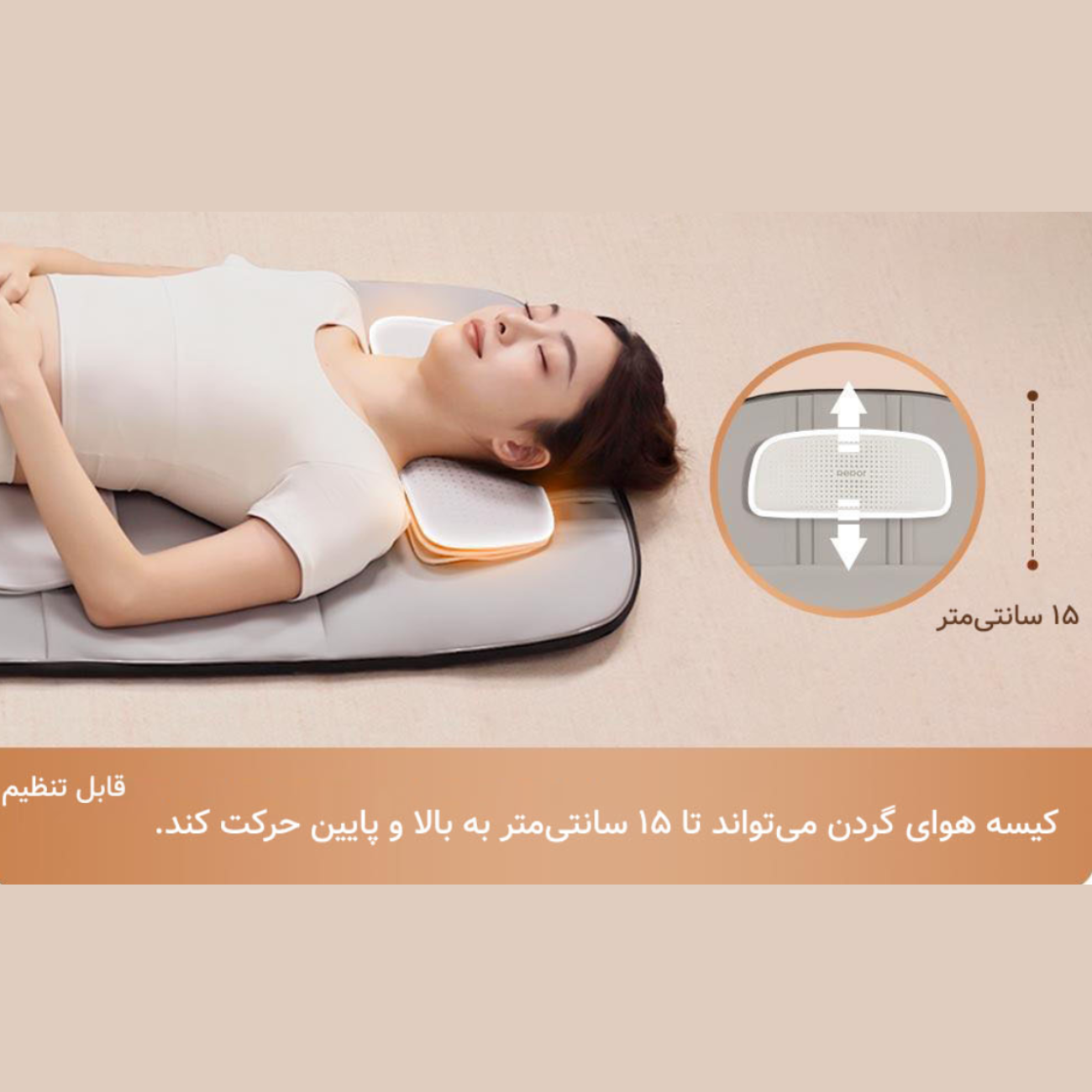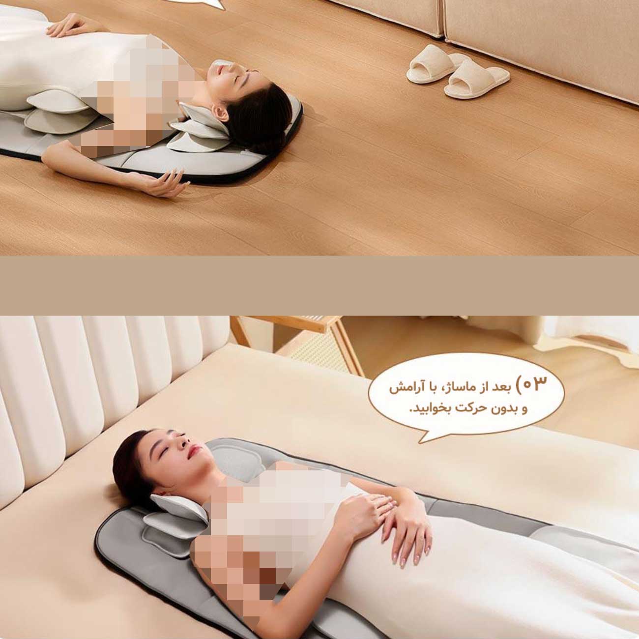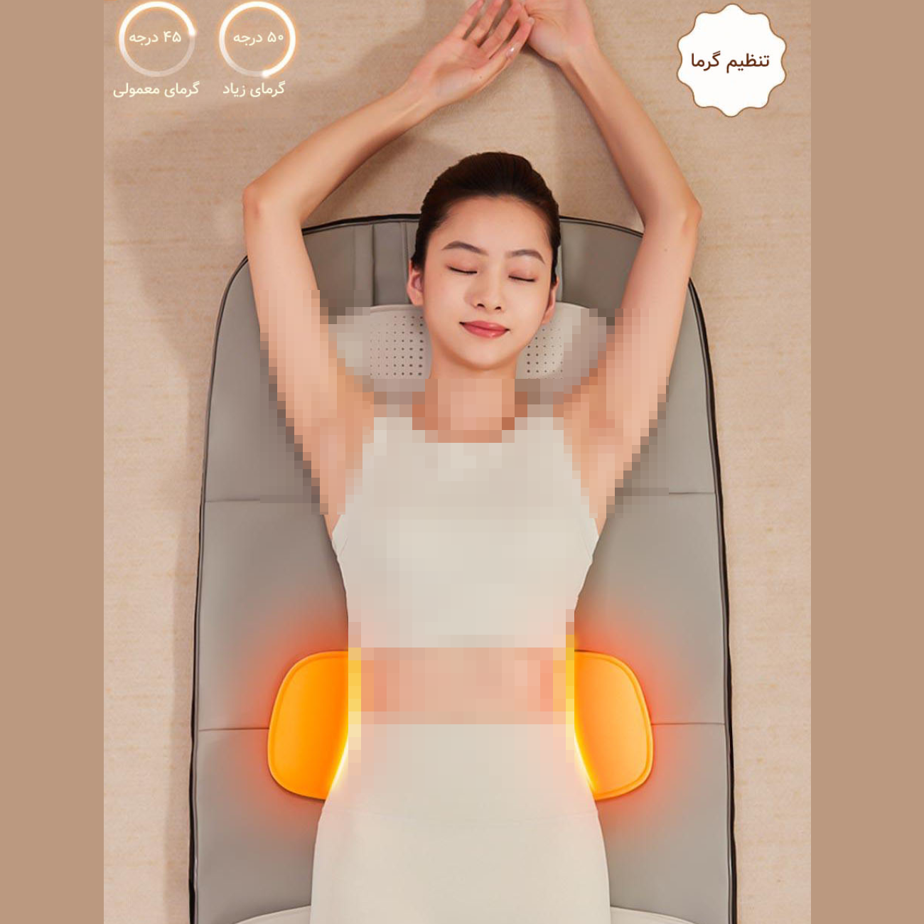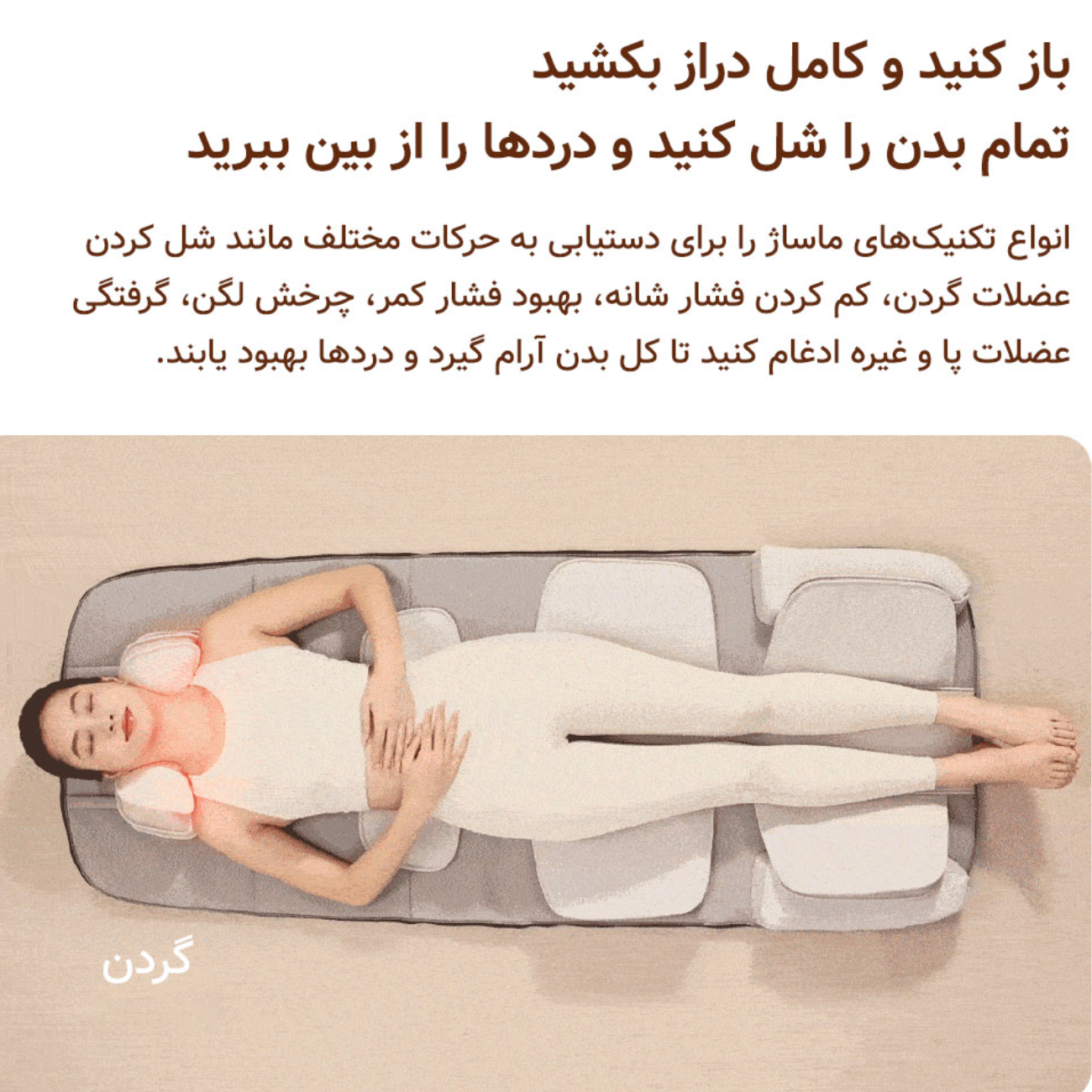 این ماساژور یک راهکار حرفهای برای دریافت ماساژ در حالت خوابیده است. این تشک با ادغام مجموعهای از تکنیکهای ماساژ، به راحتی به شل کردن عضلات گردن، کاهش فشار در ناحیه شانه، بهبود نگرانیهای کمر، چرخش لگن و کاهش گرفتگی در عضلات پا کمک میکند. بهوسیله این فناوری پیشرفته، میتوان تمامی نقاط بدن را تحت تأثیر قرار داد و به آرامش و کاهش درد در نواحی مختلف دست یافت.