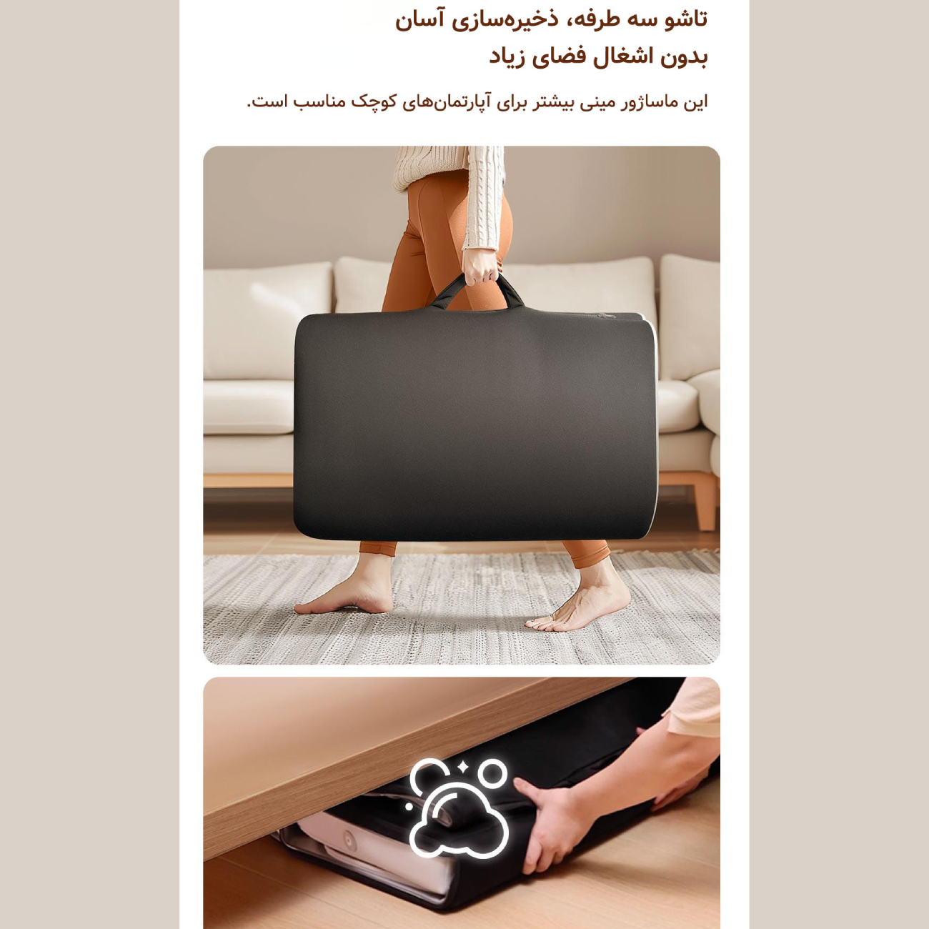 تشک ماساژور بدن، سر، کمر، گردن و پا Repor Air Wave با طراحی تاشو سهطرفه، گزینهای ایدهآل برای آپارتمانهای کوچک است. این تشک با وزن حدود 5.9 کیلوگرم به راحتی قابل جابجایی میباشد و میتوانید آن را زیر تخت یا کنار مبل نگهداری کنید. این امر امکان استفاده از فضای محدود را به حداکثر میرساند و به شما این امکان را میدهد که از تجربهای آرامشبخش بدون اشغال فضا بهرهمند شوید.