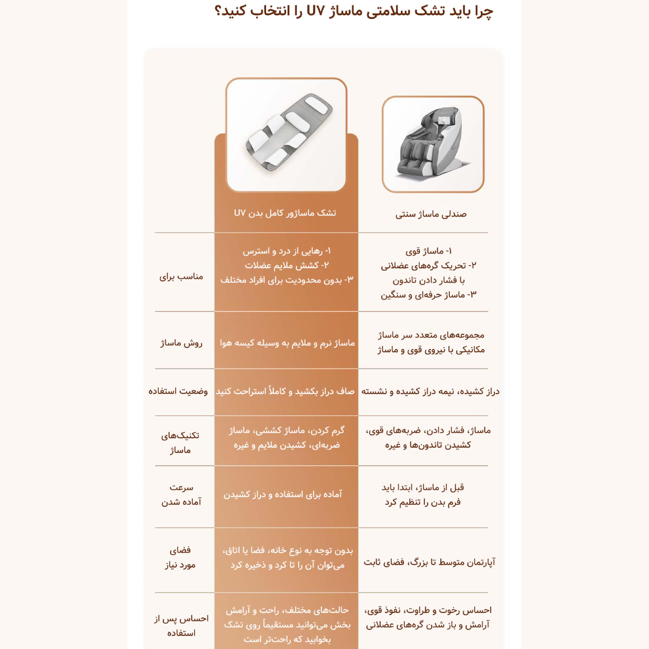 - ماساژ کل بدن برای لذت بیشتر: ماساژ دقیق شانهها، گردن، کمر، پشت، باسن و پاها، همراه با 10 نقطه فشاری اصلی برای کاهش خستگی و افزایش آرامش.