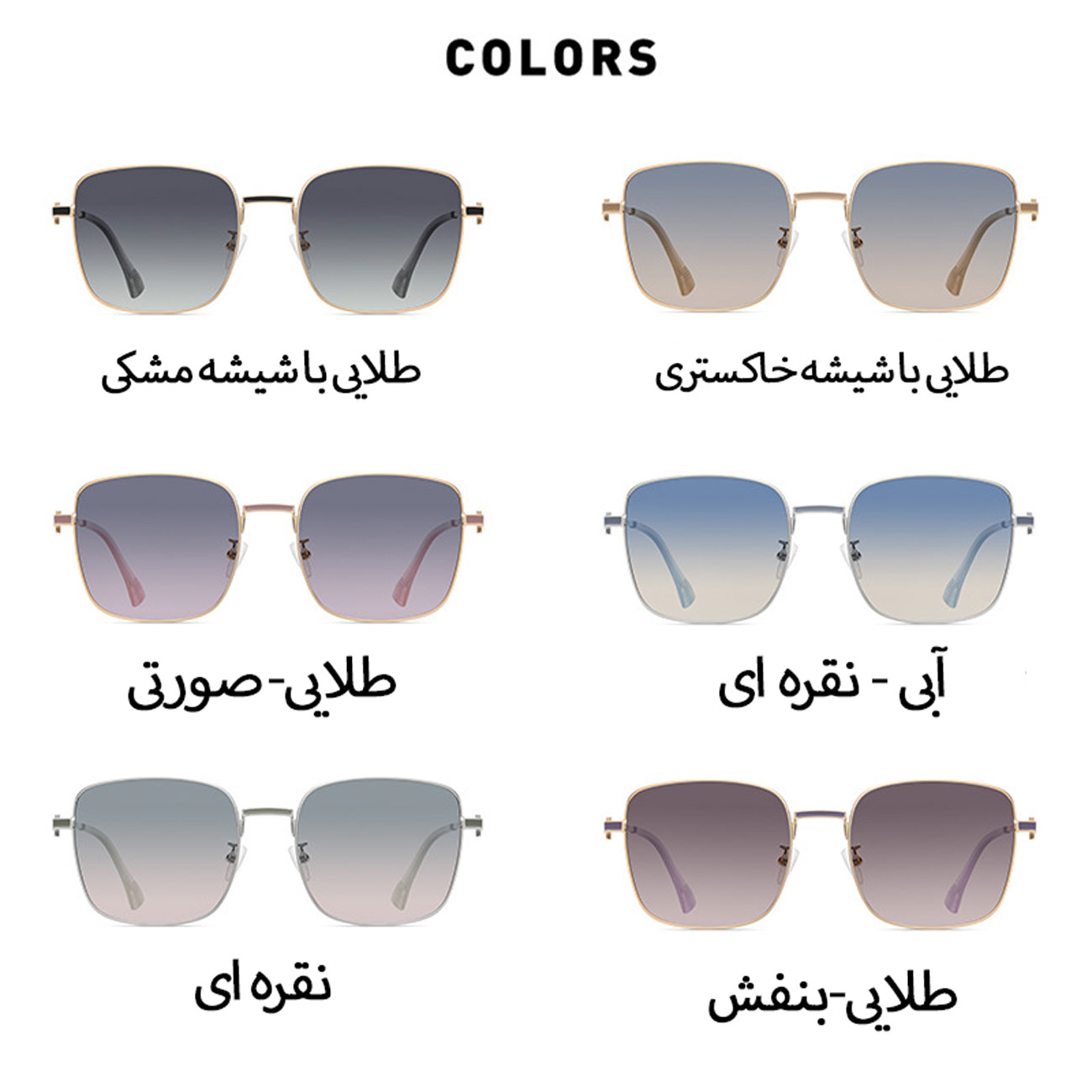 | رنگ | شیشه مشکی، طلایی با شیشه خاکستری، طلایی- بنفش، آبی-نقره ای، نقره ای، طلایی- صورتی |