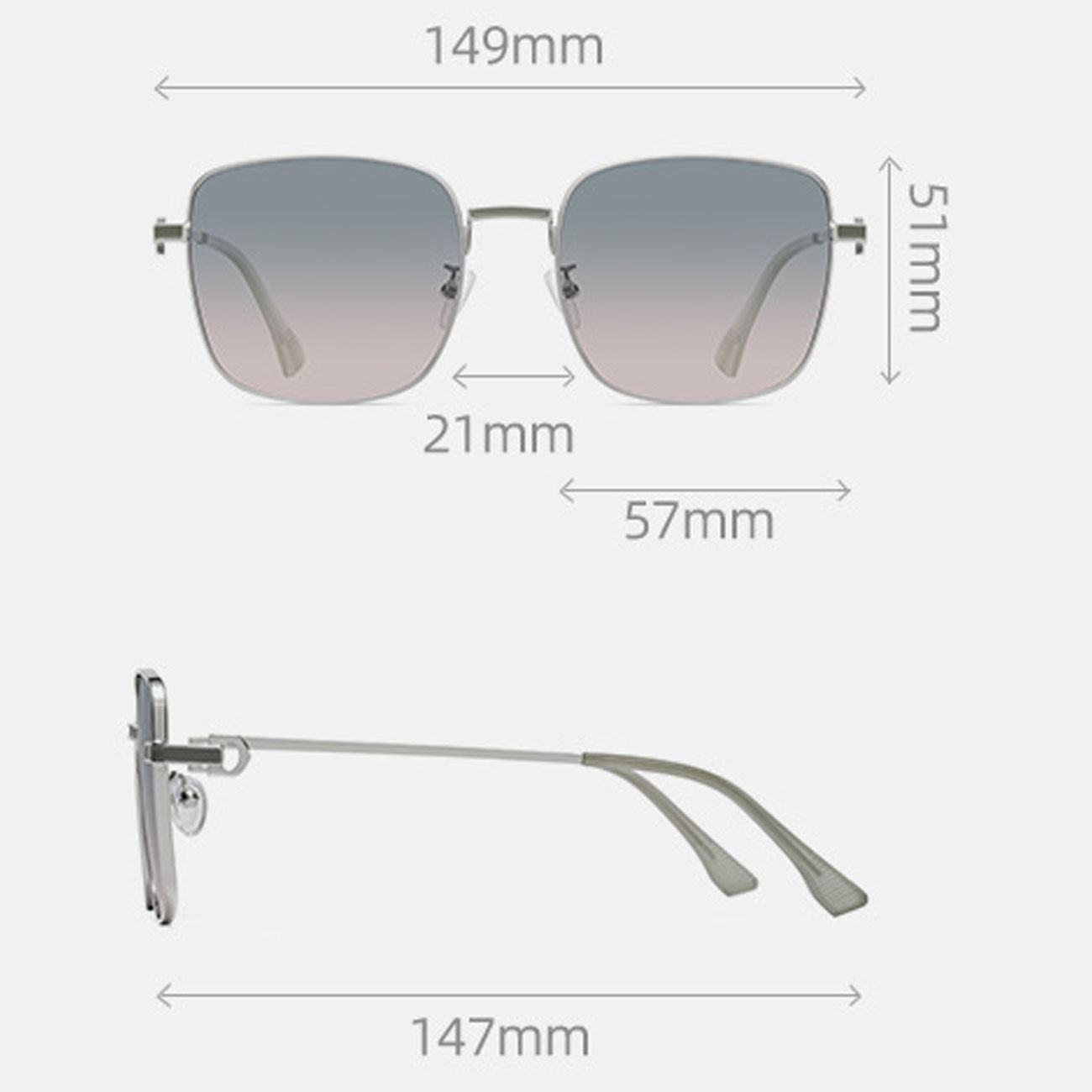عینک دودی B9003 با طراحی زاویه دار و از جنس فولاد ضد زنگ ساخته شده که بسیار سبک و راحت است و هنگام استفاده احساس سنگینی نمیکنید. ابعاد عینک 147*149*51 میلی متر و فاصله دو شیشه از هم 21 میلی متر و طول شیشه 57 میلی متر و وزن آن حدود 28.3 گرم است؛ این عینک با توجه به اینکه بافت ظریفی دارد ولی به راحتی تغییر شکل نمیدهد. پدهای کناره بینی کاملا مطابق استانداردهای بینی ساخته شده است و هیچگونه فشاری روی بینی شما ندارند. دسته های عینک با قوس ملایم طراحی شده اند تا از لغزش آن جلوگیری شود. کیت لولاها محکم و تثبیت شده طراحی شده است تا از شل شدن پیچ ها جلوگیری شود.