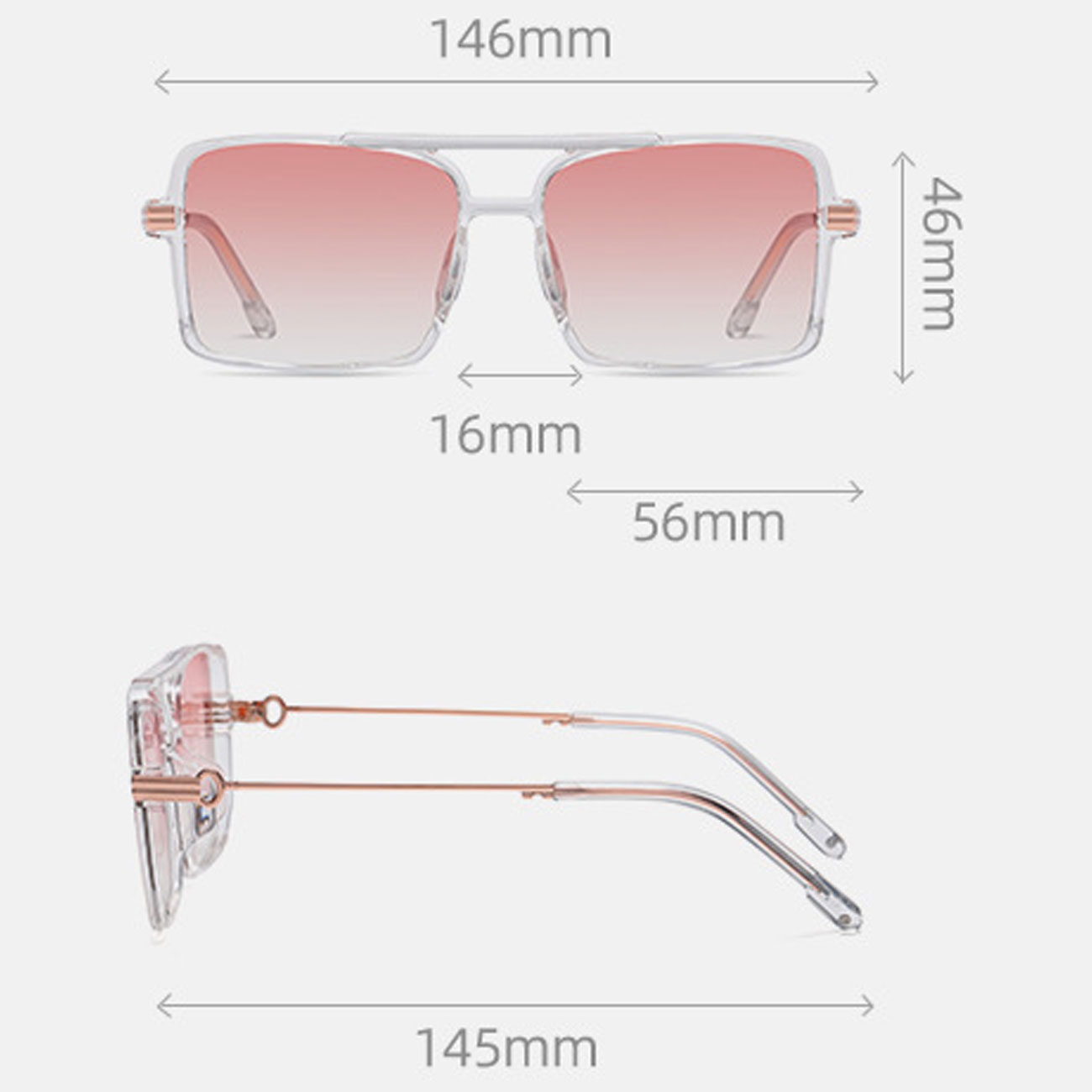 عینک دودی A0731 با طراحی زاویه دار و از جنس فولاد ضد زنگ و TR90 ساخته شده که بسیار سبک و راحت است و هنگام استفاده احساس سنگینی نمیکنید. ابعاد عینک 146*145*46 میلی متر و فاصله دو شیشه از هم 16 میلی متر و طول شیشه 56 میلی متر و وزن آن حدود 31.3 گرم است؛ این عینک با توجه به اینکه بافت ظریفی دارد ولی به راحتی تغییر شکل نمیدهد. پدهای کناره بینی کاملا مطابق استانداردهای بینی ساخته شده است و هیچگونه فشاری روی بینی شما ندارند. دسته های عینک با قوس ملایم طراحی شده اند تا از لغزش آن جلوگیری شود. کیت لولاها محکم و تثبیت شده طراحی شده است تا از شل شدن پیچ ها جلوگیری شود.
