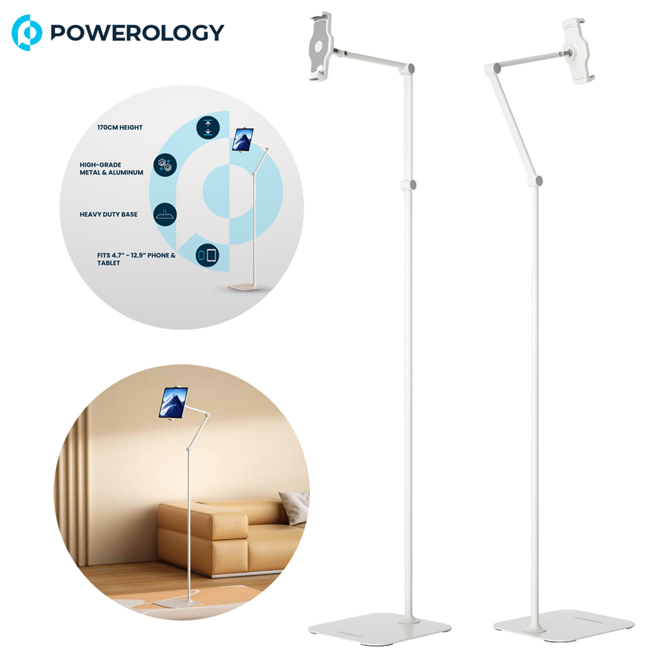 استند تبلت و گوشی موبایل قابل تنظیم و چرخشی Powerology با پایه فلزی مدل PTBS170WH: ترکیب استحکام و انعطاف