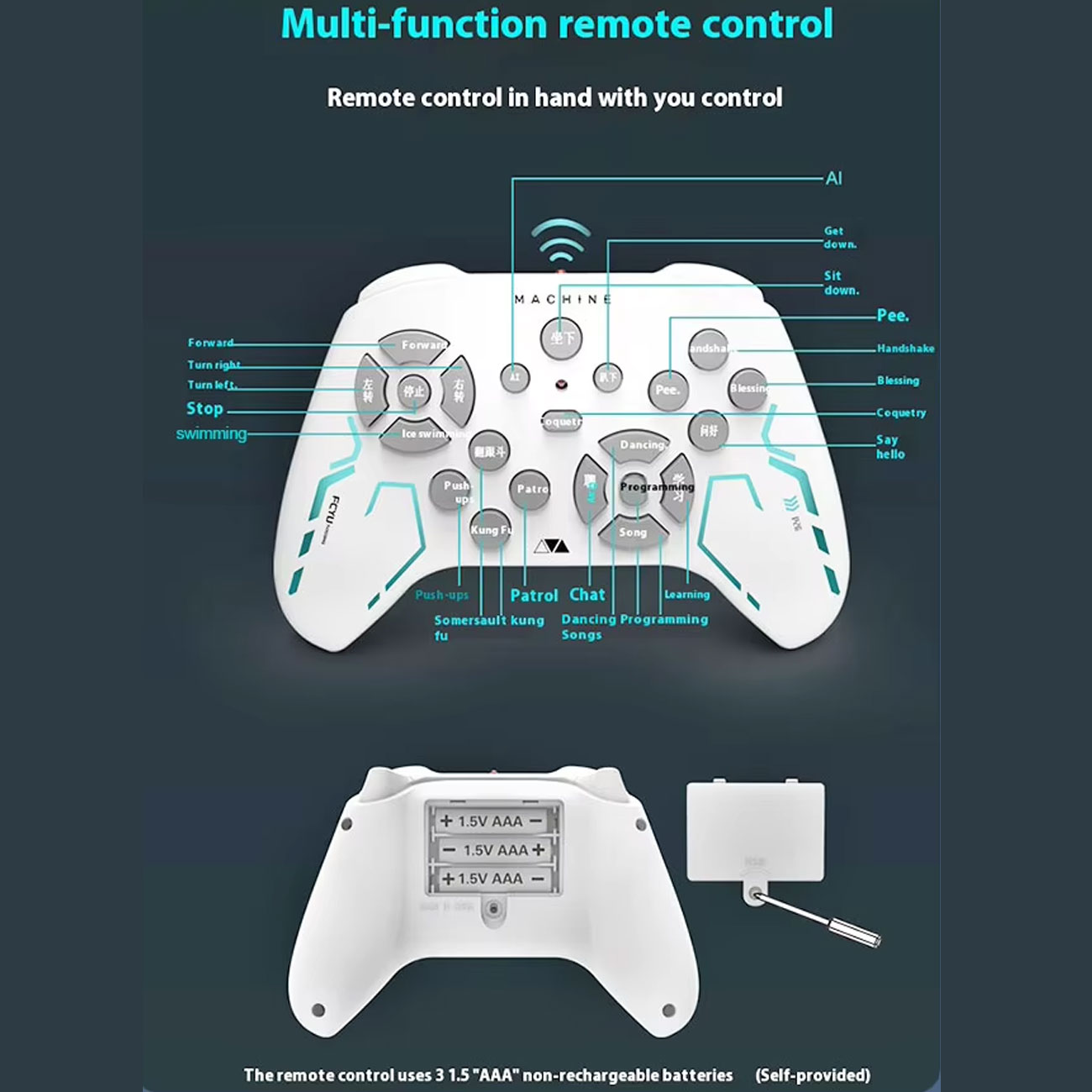 | قابلیتها | واکنش به فرمان صوتی و لمسی، حرکت به جلو، عقب، چرخش چپ و راست، داستانگویی، گفتوگو با هوش مصنوعی، پخش موسیقی و رقص، برنامهریزی حرکات، حرکات متنوع شامل شنا، پشتک، نشستن، یوگا، کونگفو، گشتزنی، دست دادن، ادرار کردن، حرکات بانمک، شلیک تیر ژلهای |