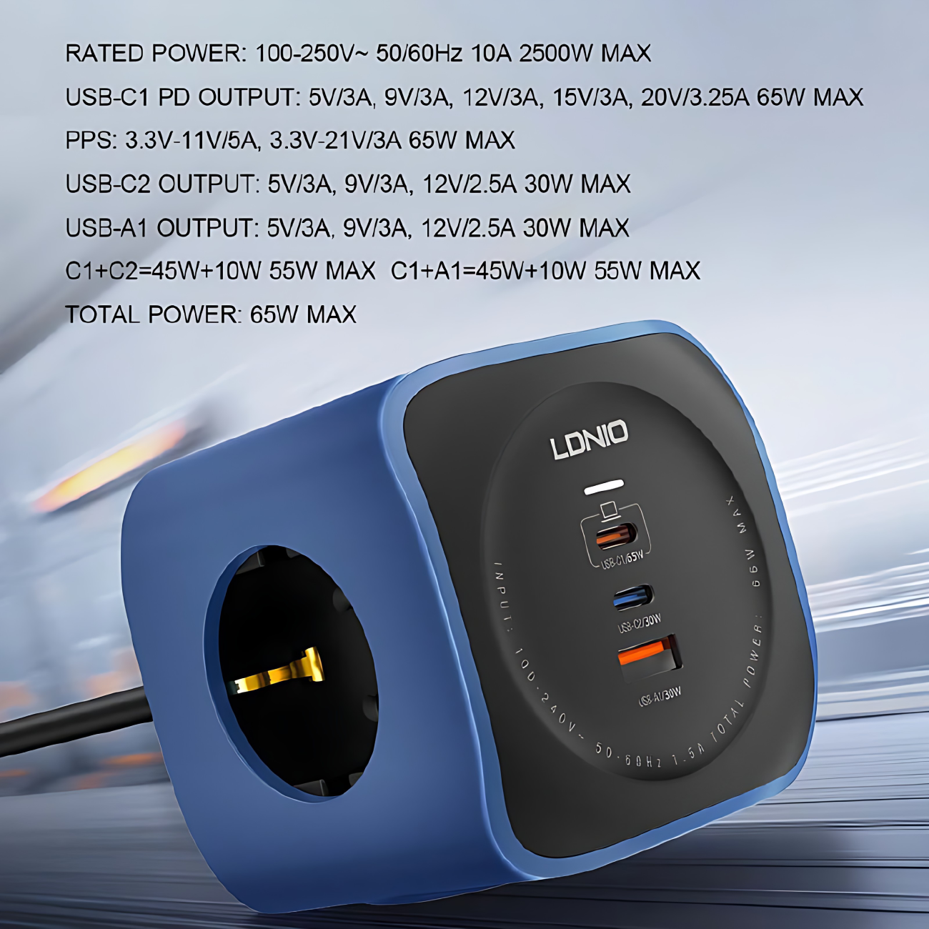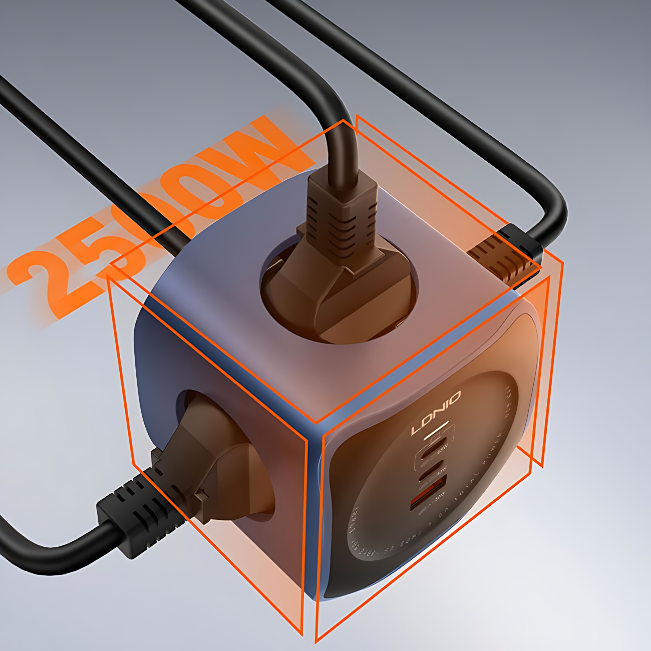 چند راهی برق مکعبی 2500 وات 3 سوکت، 1 یواسبی و 2 تایپسی 65 وات شارژ سریع رومیزی الدنیو SE3338
