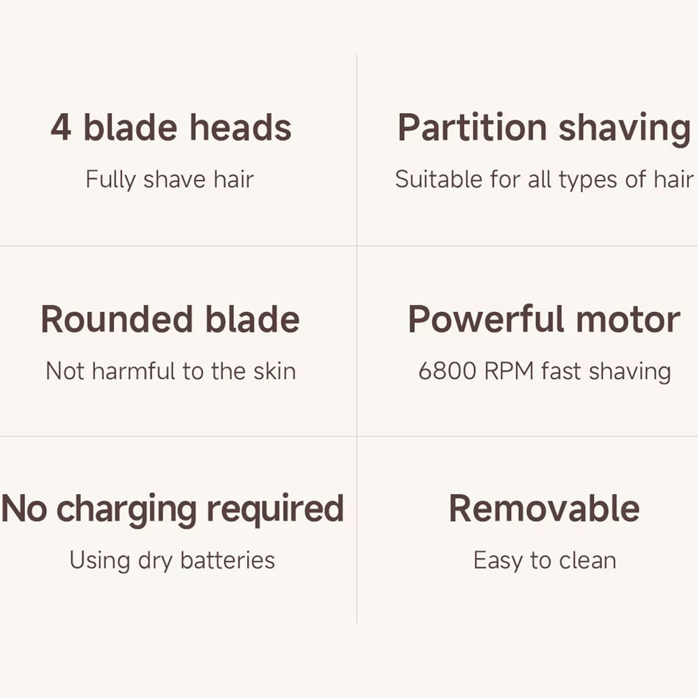 | لوازم همراه | دستگاه اصلی، 4 تیغه، 4 شانه محدود کننده طول، باتری AA، برس تمیزکننده، کیف نگهداری، دفترچه راهنما، جعبه هدیه |