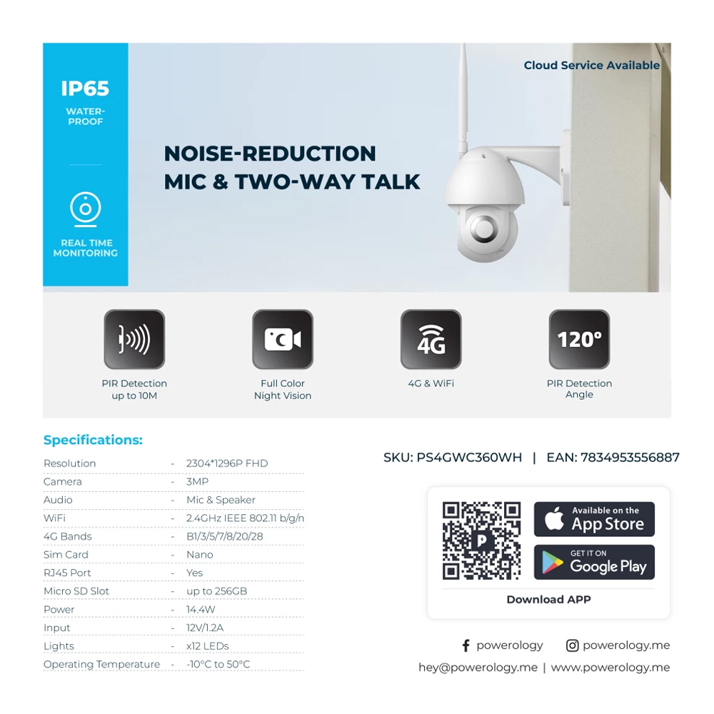 Powerology 4G Outdoor Camera Vertical & Horizontal Tilt PS4GWC360WH