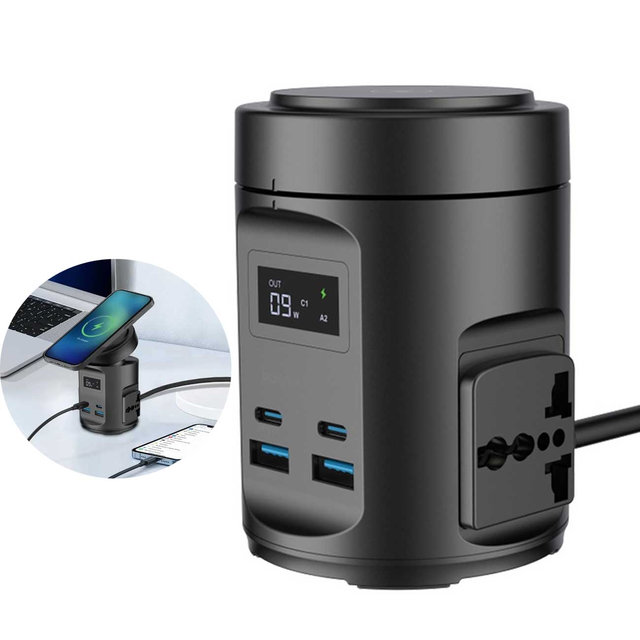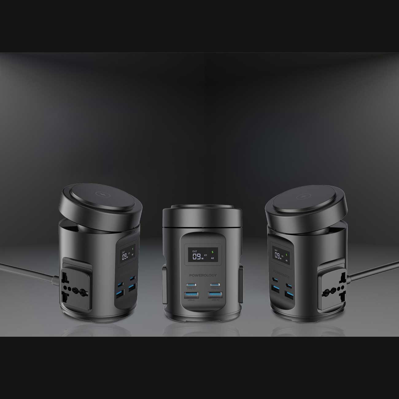 شارژر وایرلس رومیزی 15 وات و چندراهی برق 2200 وات دو یو اس بی، دو تایپ سی و دو سوکت برق پاورولوژی PWCUQC014