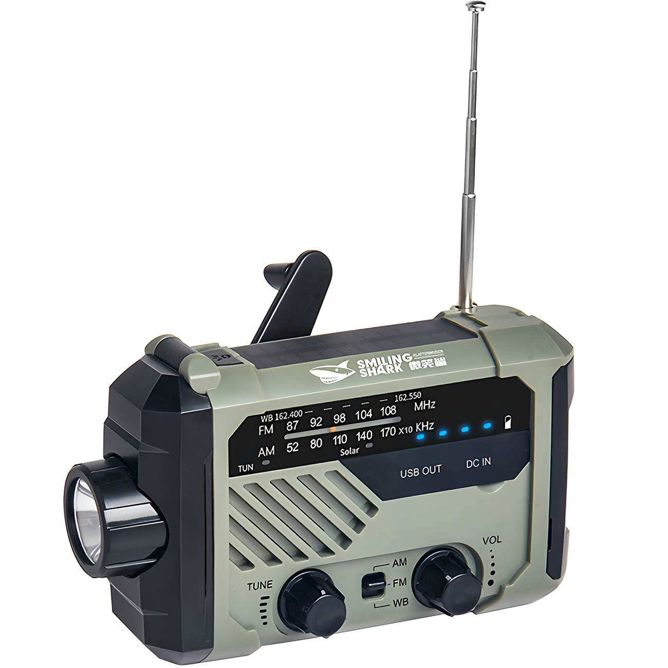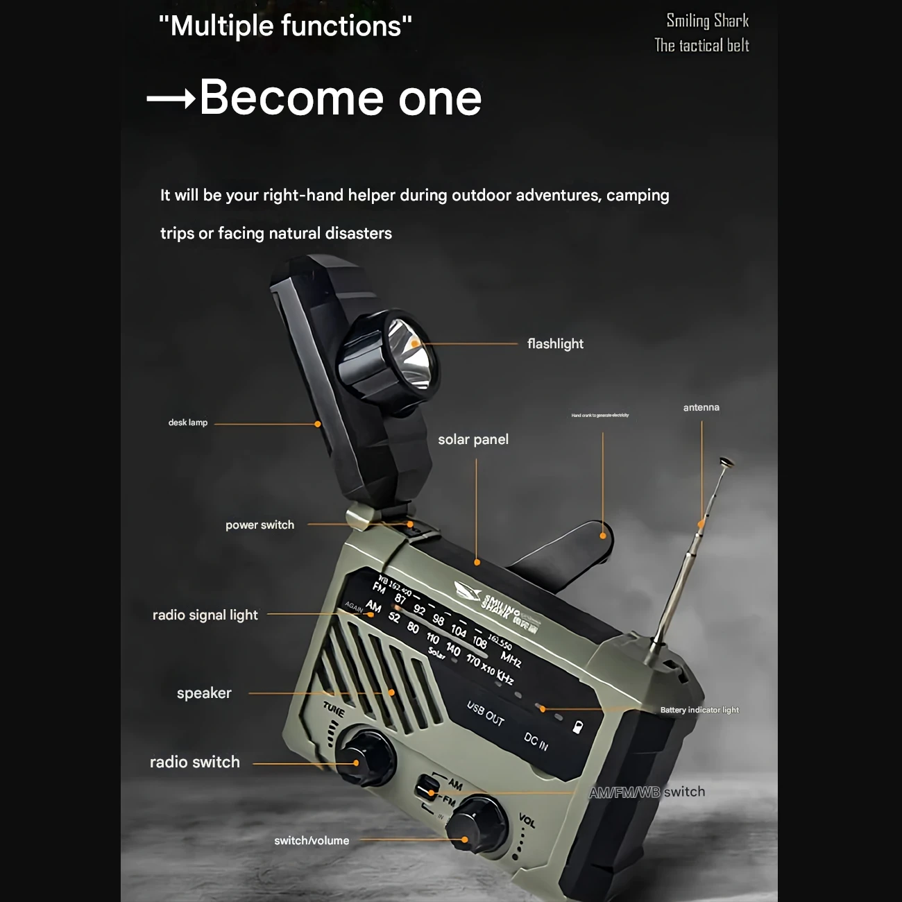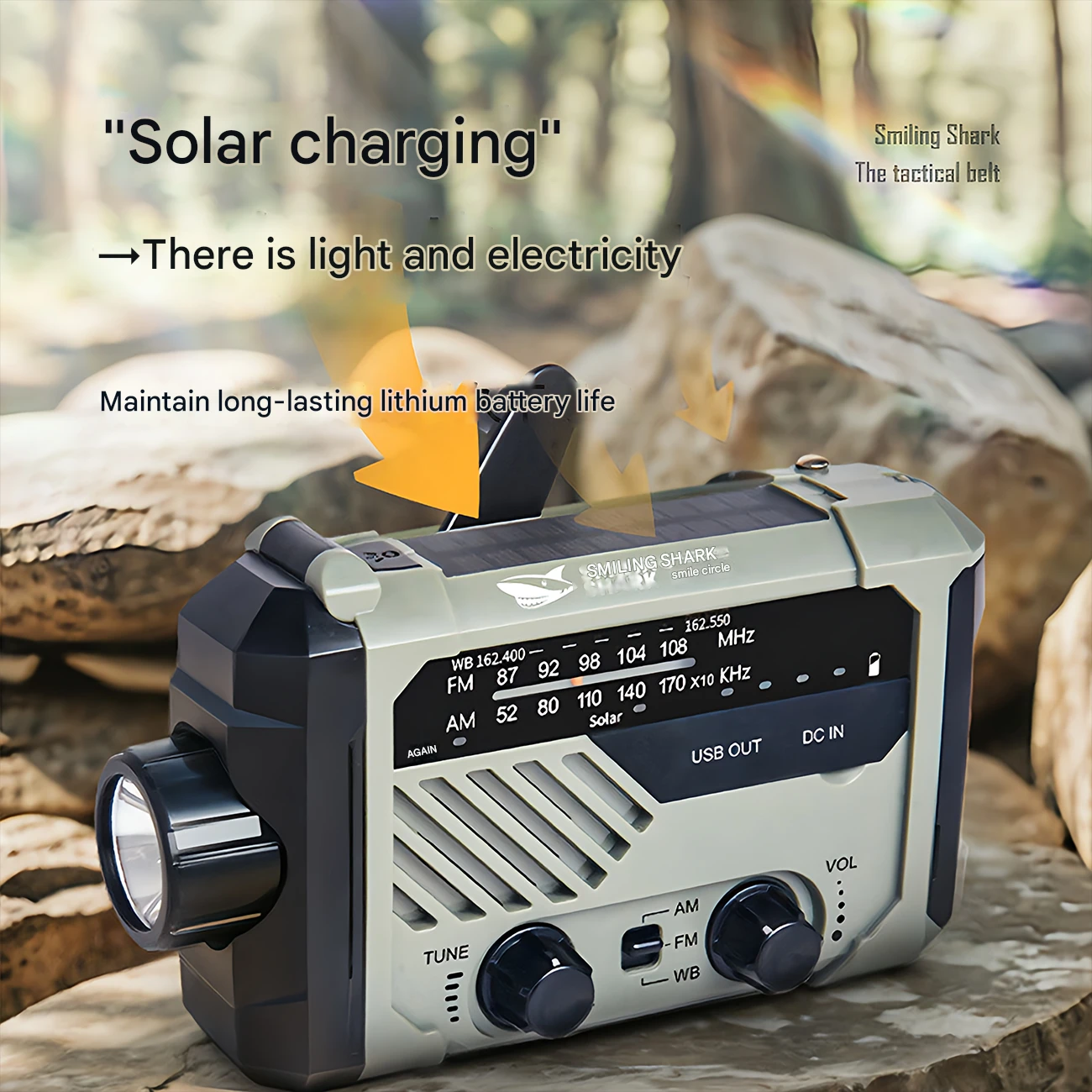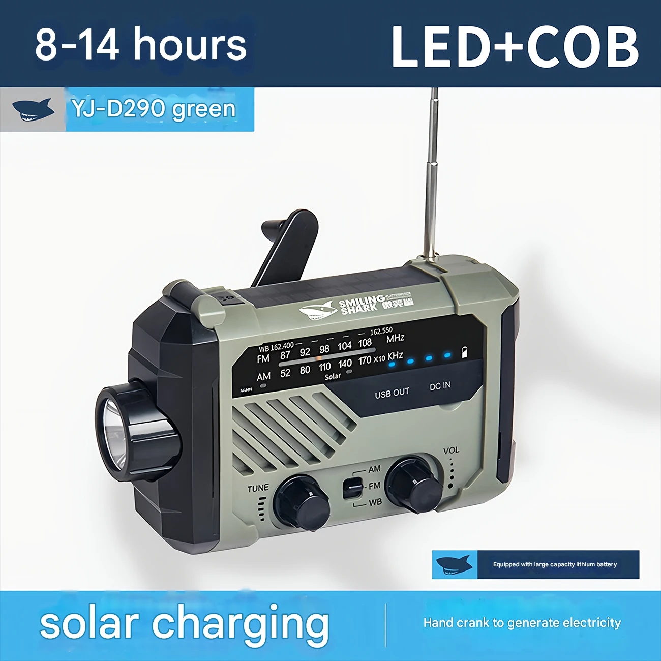 چراغ قوه شارژی و لامپ کمپینگ خورشیدی ضدآب چندمنظوره اسمایلینگ شارک Smiling Shark YJ-D290 با رادیو، پاوربانک و ژنراتور دستی