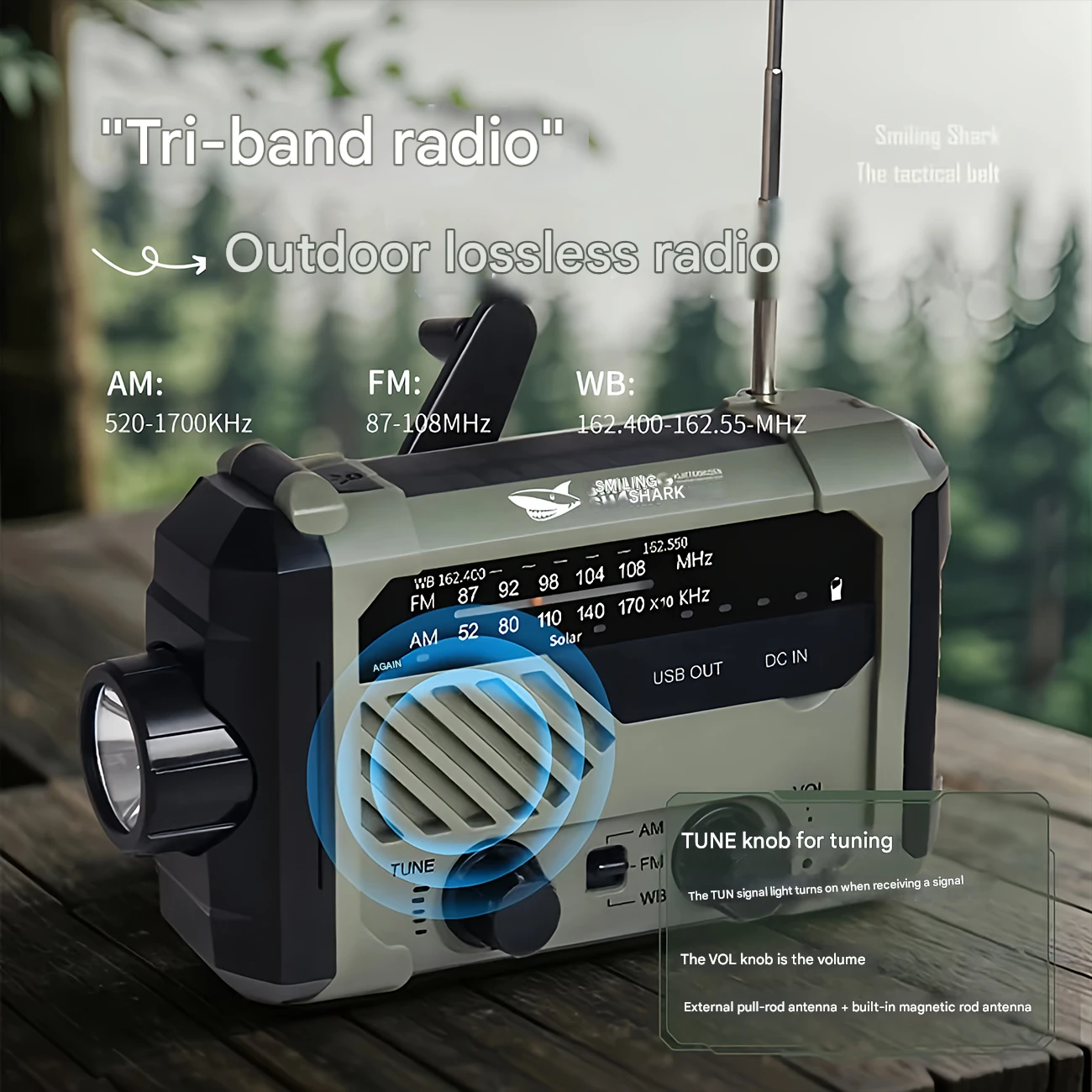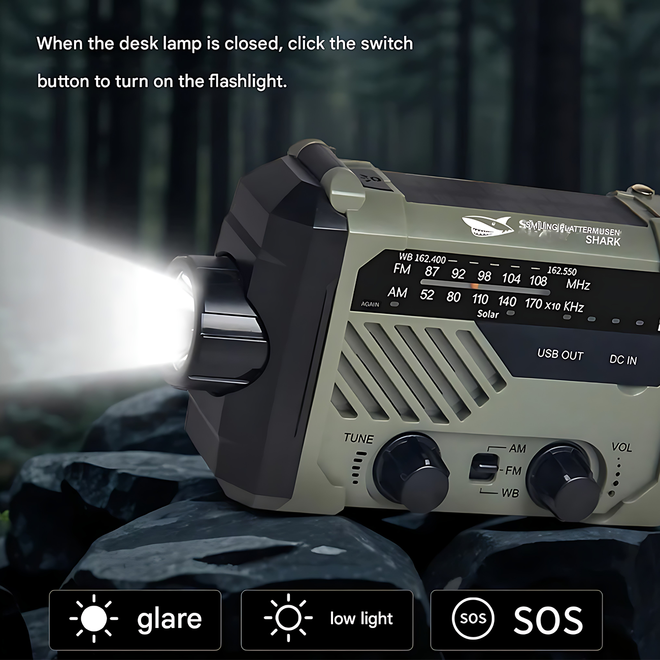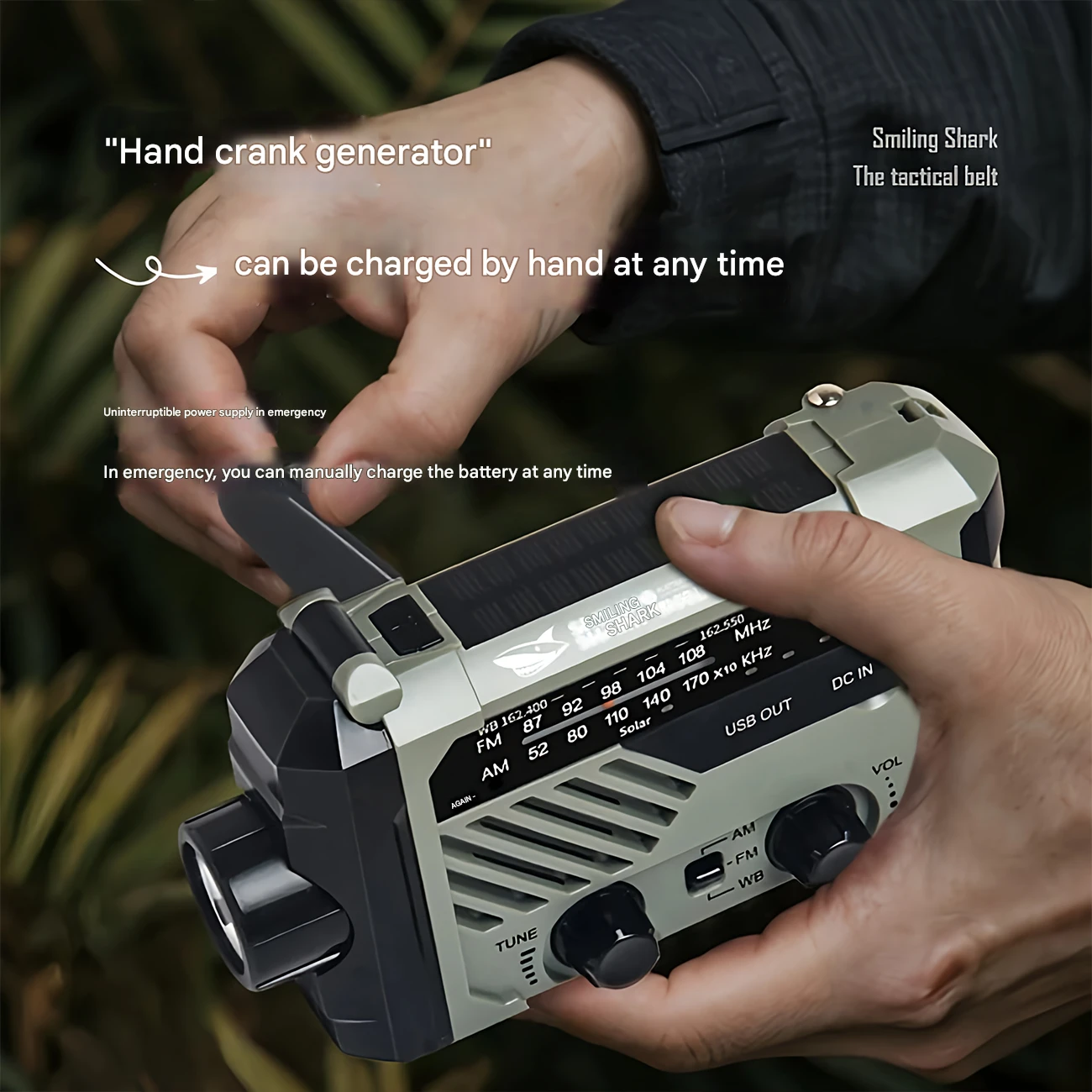 چراغ قوه شارژی و لامپ کمپینگ خورشیدی ضدآب چندمنظوره اسمایلینگ شارک Smiling Shark YJ-D290 با رادیو، پاوربانک و ژنراتور دستی