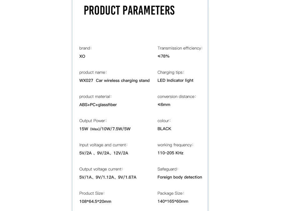 | مشخصات هولدر و شارژر وایرلس داخل خودرو 15 وات ایکساو XO WX027 | |