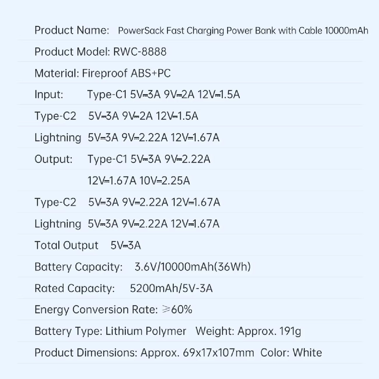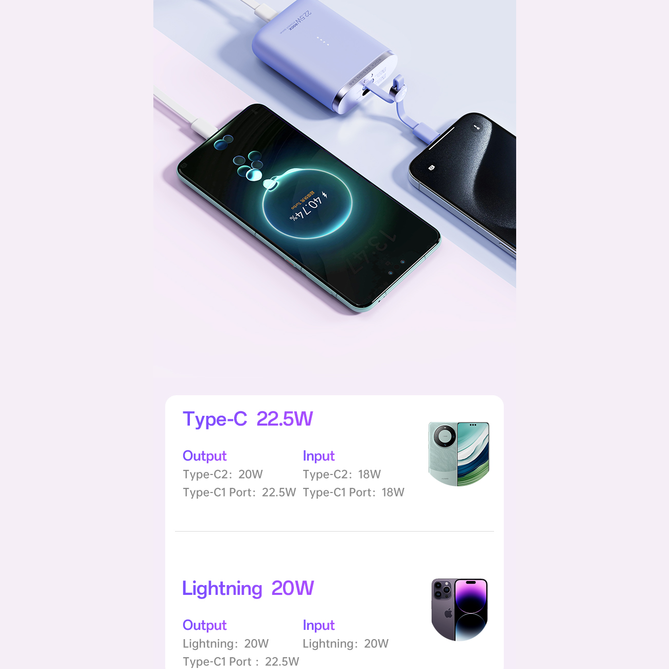 | توان خروجی | Type-C1: 5V=3A 9V=2.22A 12V=1.67A 10V=2.25A Type-C2: 5V=3A 9V=2.22A 12V=1.67A Lightning: 5V=3A 9 |