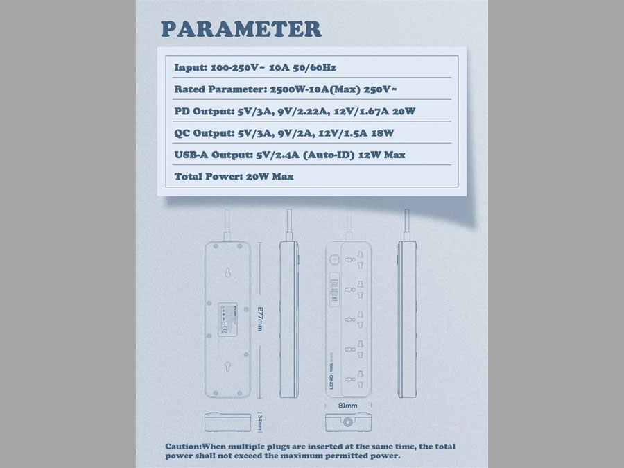 | مشخصات چند راهی برق 3 سوکت، 3 یو اس بی و 1 تایپ سی الدنیو | |