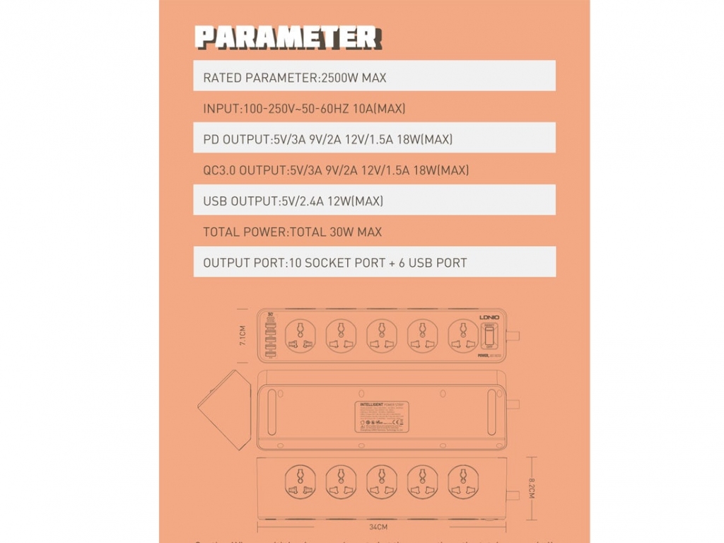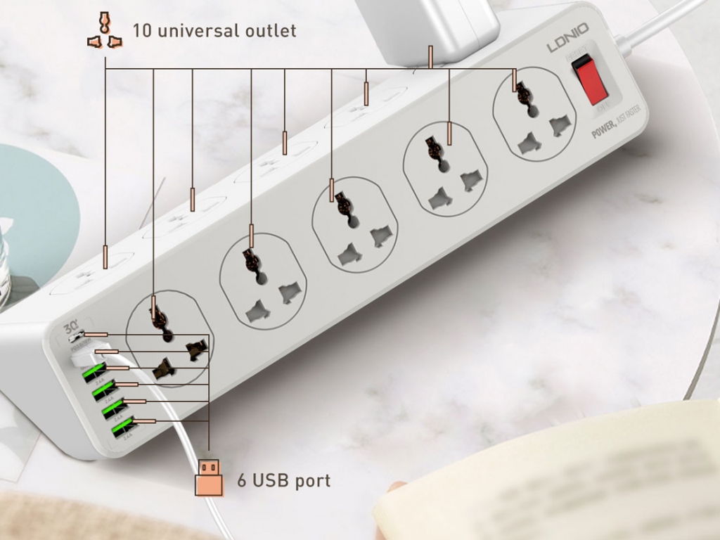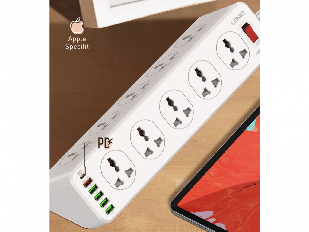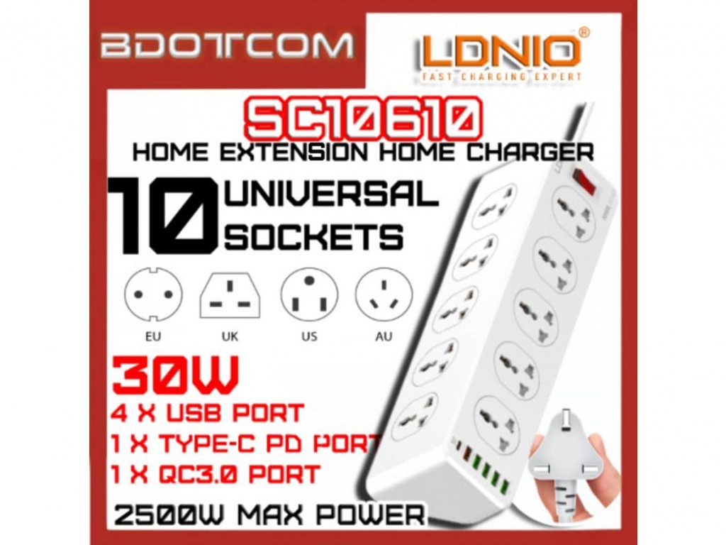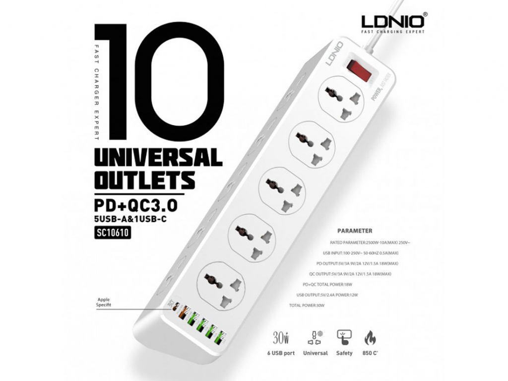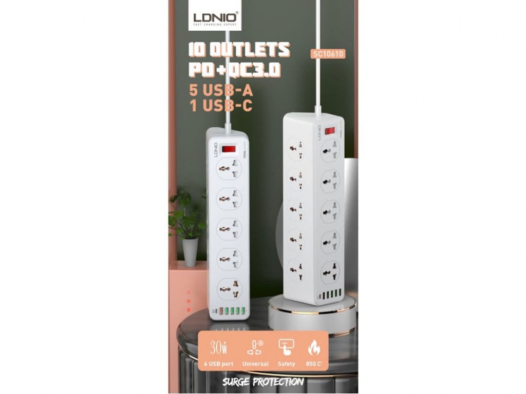 | مشخصات چندراهی برق 10 سوکت، 5 یواسبی و یک تایپسی الدنیو Ldnio Power Strip 2500W 10 Sockets + 4 USB Ports + 1 Type-C PD Port + 1 QC3.0 Port2 m UK Plug SC10610 | |