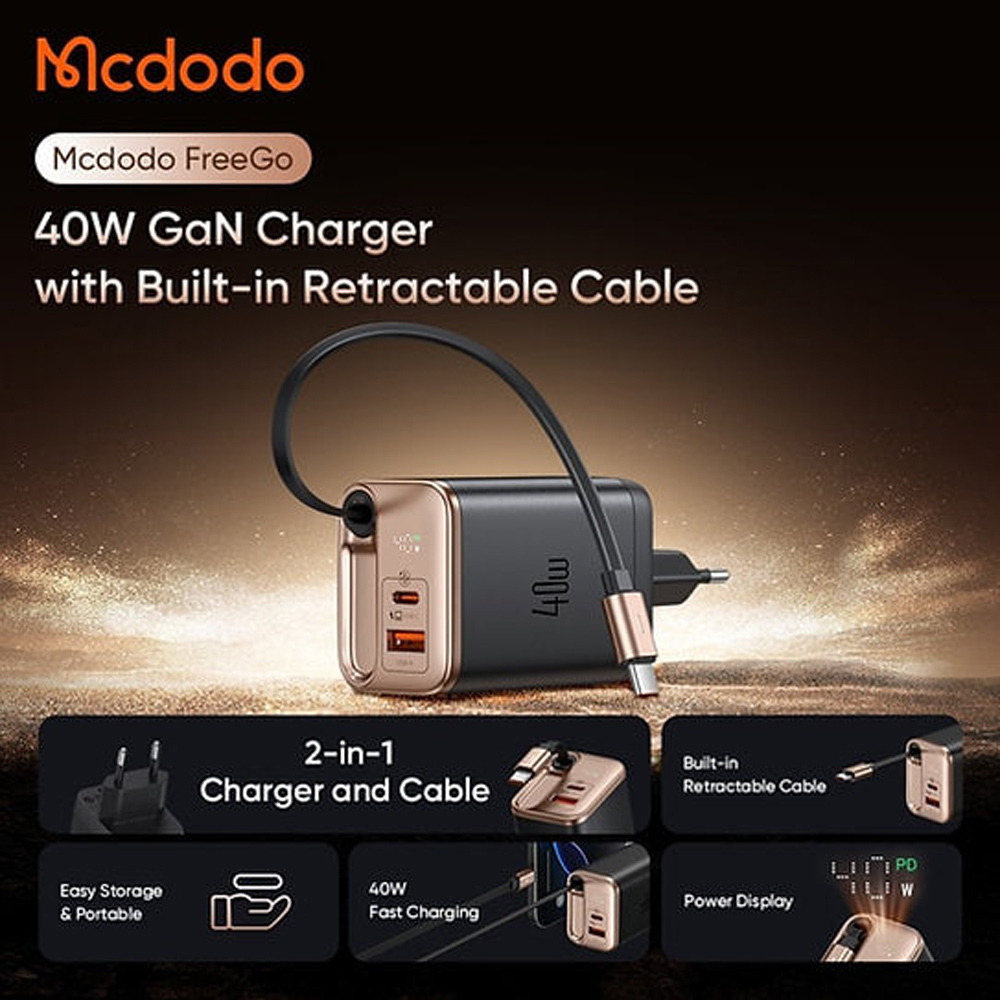 MCDODO CH-428 FreeGo Charger 40W GAN Dual Port Built in USB-C Retractable Cable