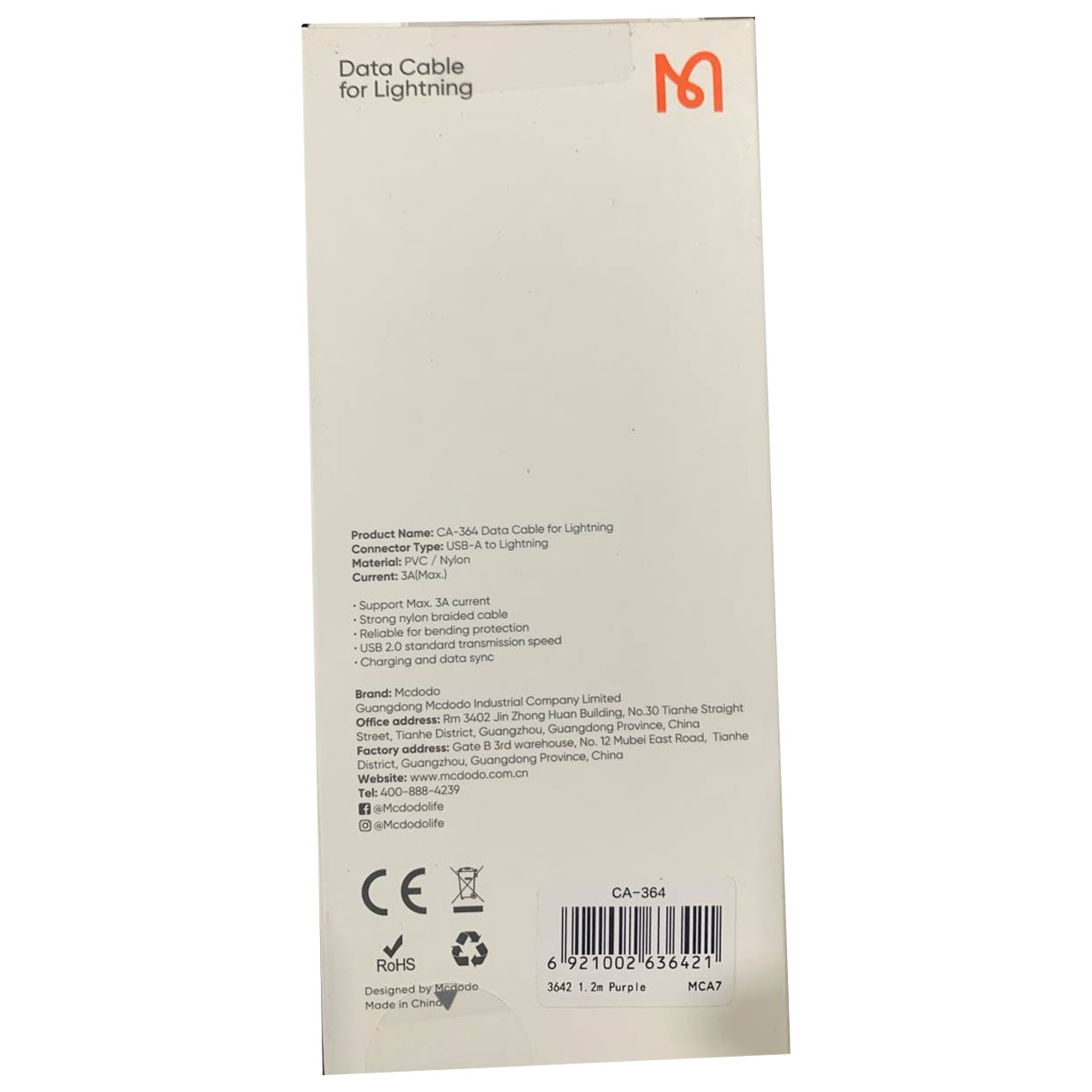کابل فست شارژ یو اس بی به لایتنینگ 3 آمپر 1.2 متری مک دودو CA-364