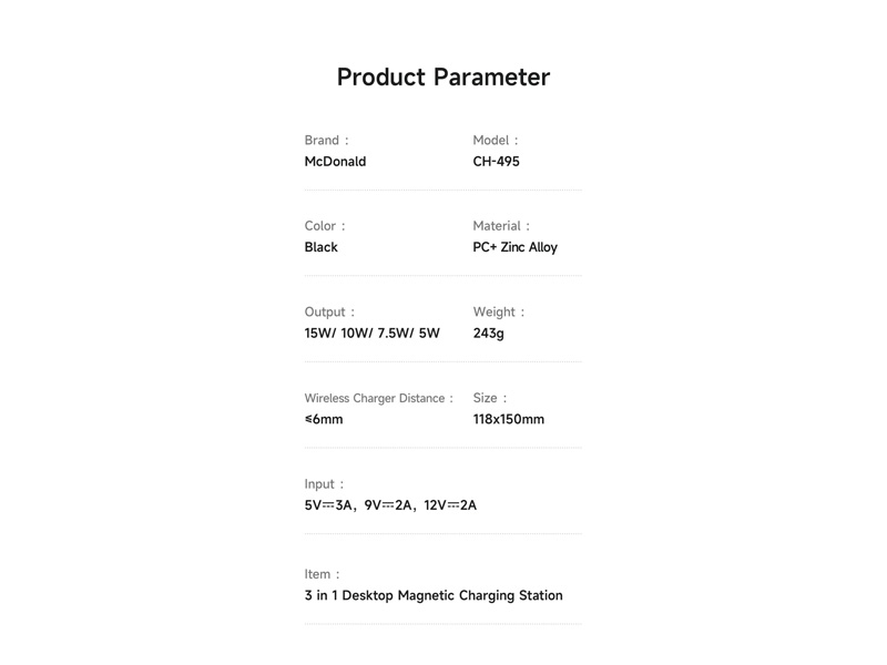 | جریان خروجی | 15W/ 10W/ 7.5W/ 5W,Total Output:Max. 22.5W(15W+5W+2.5W) |