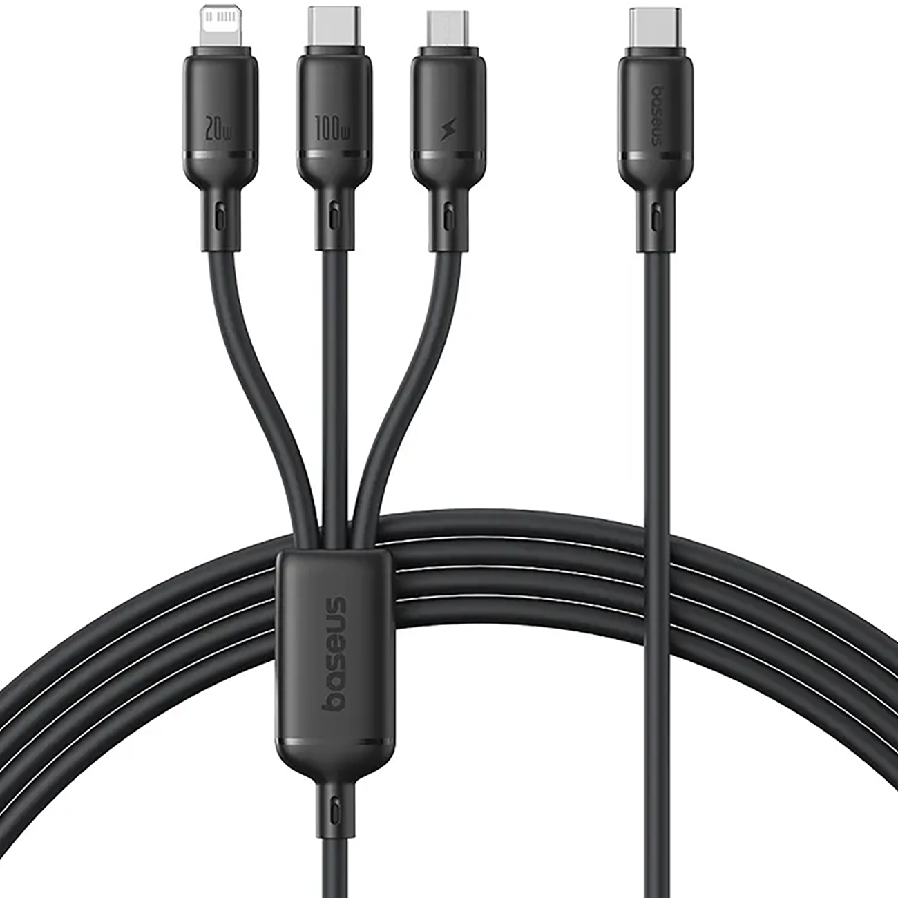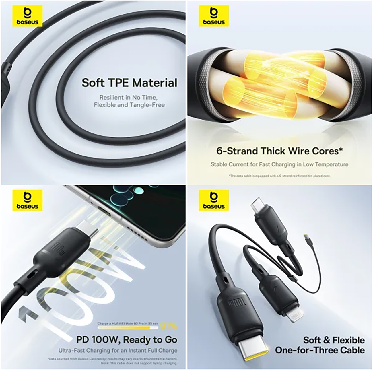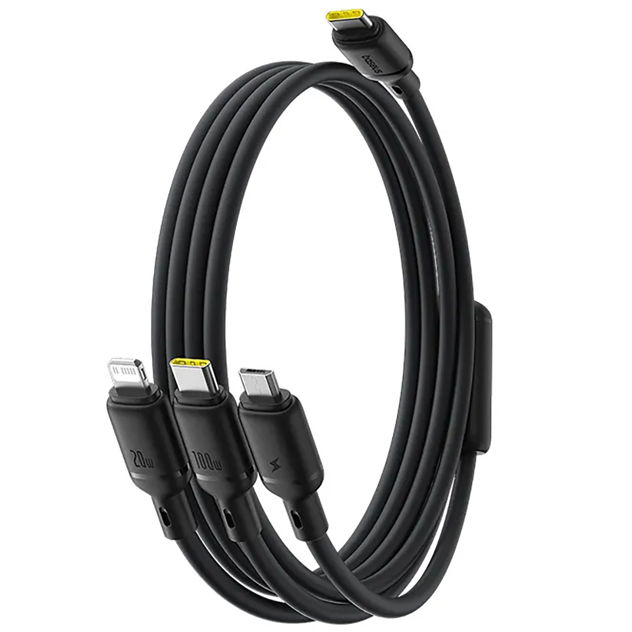 کابل شارژ چندکاره سه سر تایپسی به تایپ سی، لایتنینگ و میکرو یواسبی 100 وات 5 آمپر 1.5 متری بیسوس CB000166