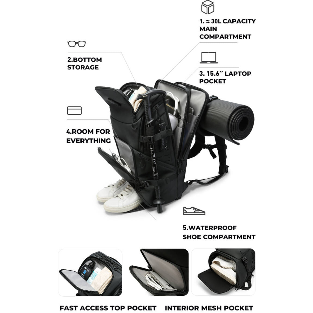 | بخش ها و جیب ها | محفظه اصلی، محفظه پایینی، جیب بالایی سریع، جیب داخلی توری، محفظه کفش ضدآب |