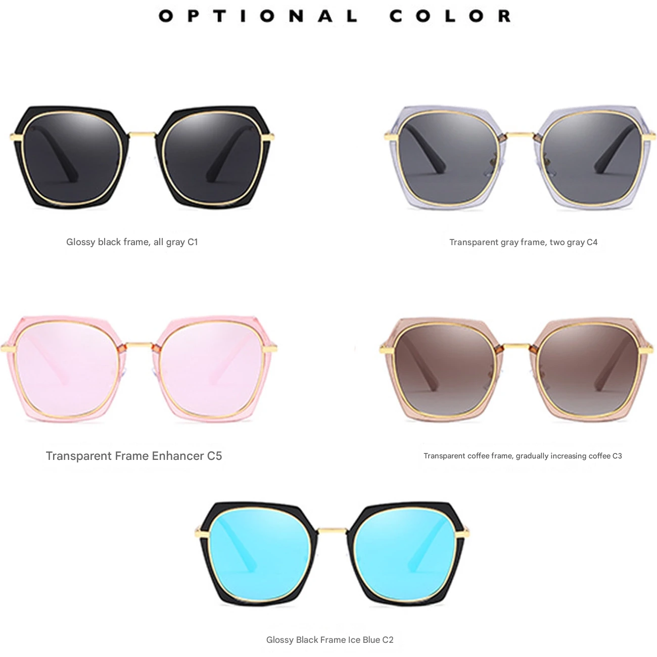 | رنگبندی | مشکی براق طوسی، مشکی براق آبی یخی، قهوهای شفاف گرادینت، طوسی شفاف، صورتی شفاف |