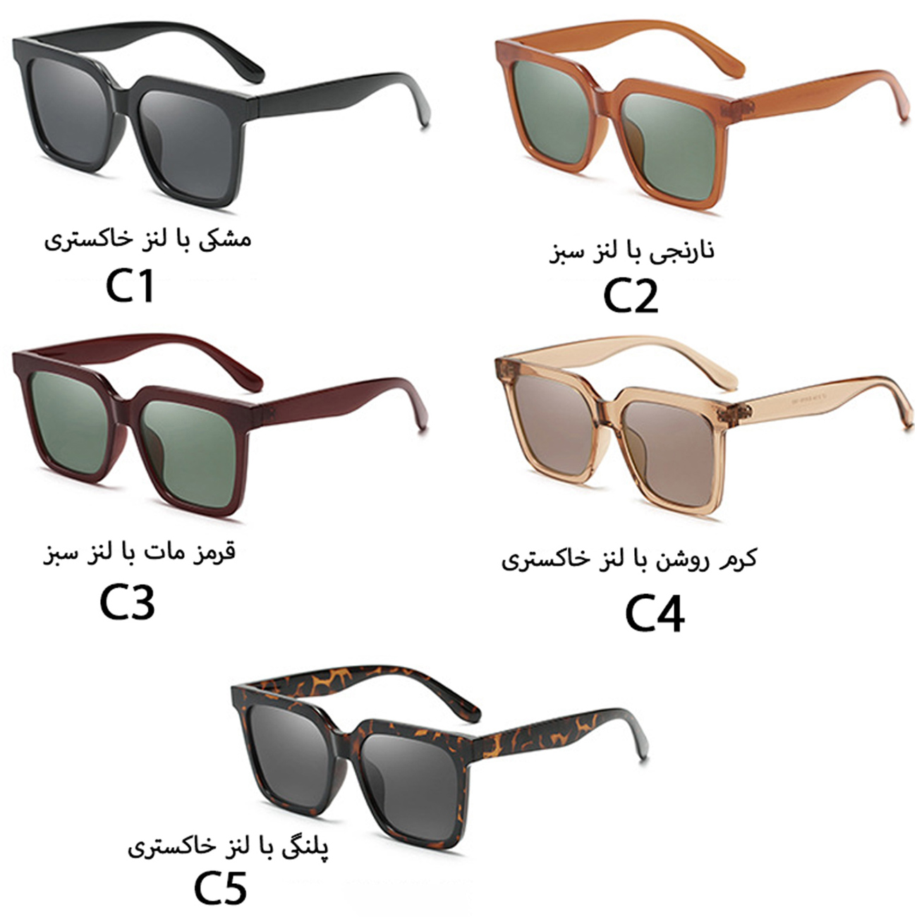 | رنگ | مشکی با لنز خاکستری، نارنجی با لنز سبز، قرمز مات با لنز سبز، کرم روشن با لنز خاکستری و پلنگی با لنز خاکستری |