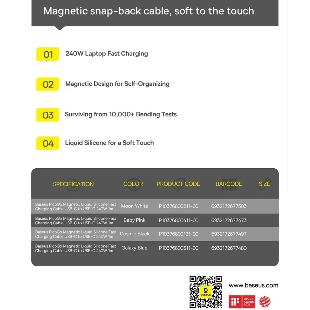 Baseus PicoGo Magnetic Liquid Silicone Fast Charging Cable USB-C to USB-C 240W 1m P10376800121-00/CB000153
